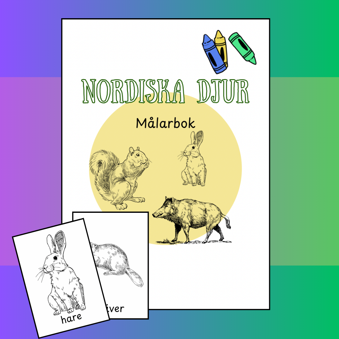 Målarboken ”Nordiska Djur” innehåller 10 sidor med olika motiv relaterade till djur som lever i de nordiska länderna. Varje sida erbjuder bilder av älgar, renar, lodjur och andra vilda djur som barn kan färglägga. Boken syftar till att stimulera kreativitet och ge en introduktion till nordisk faunans