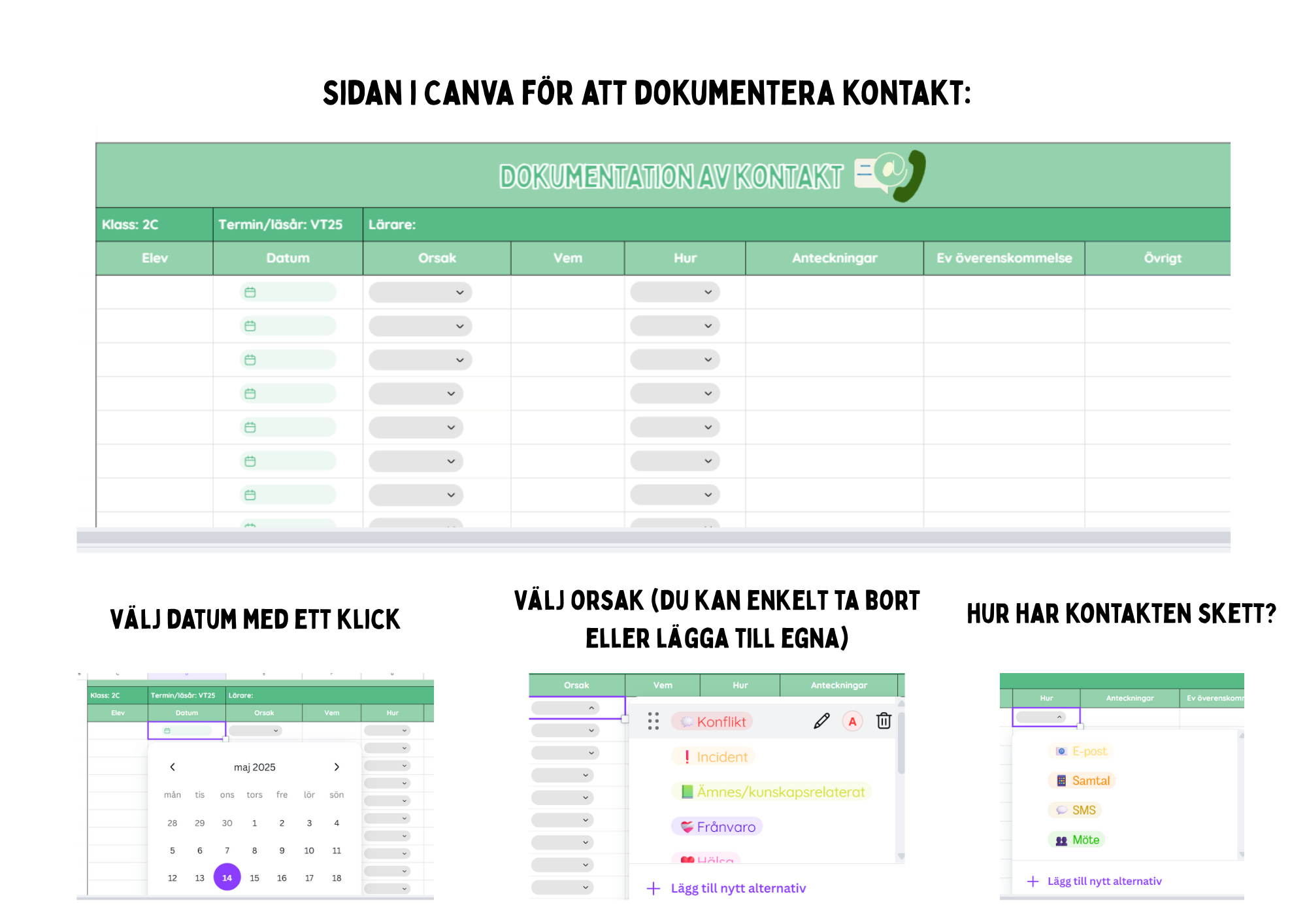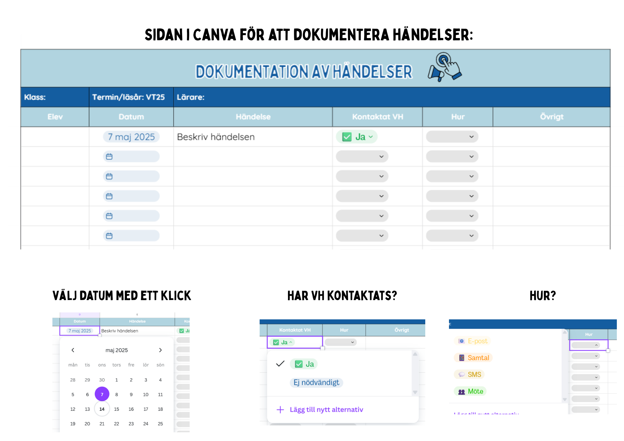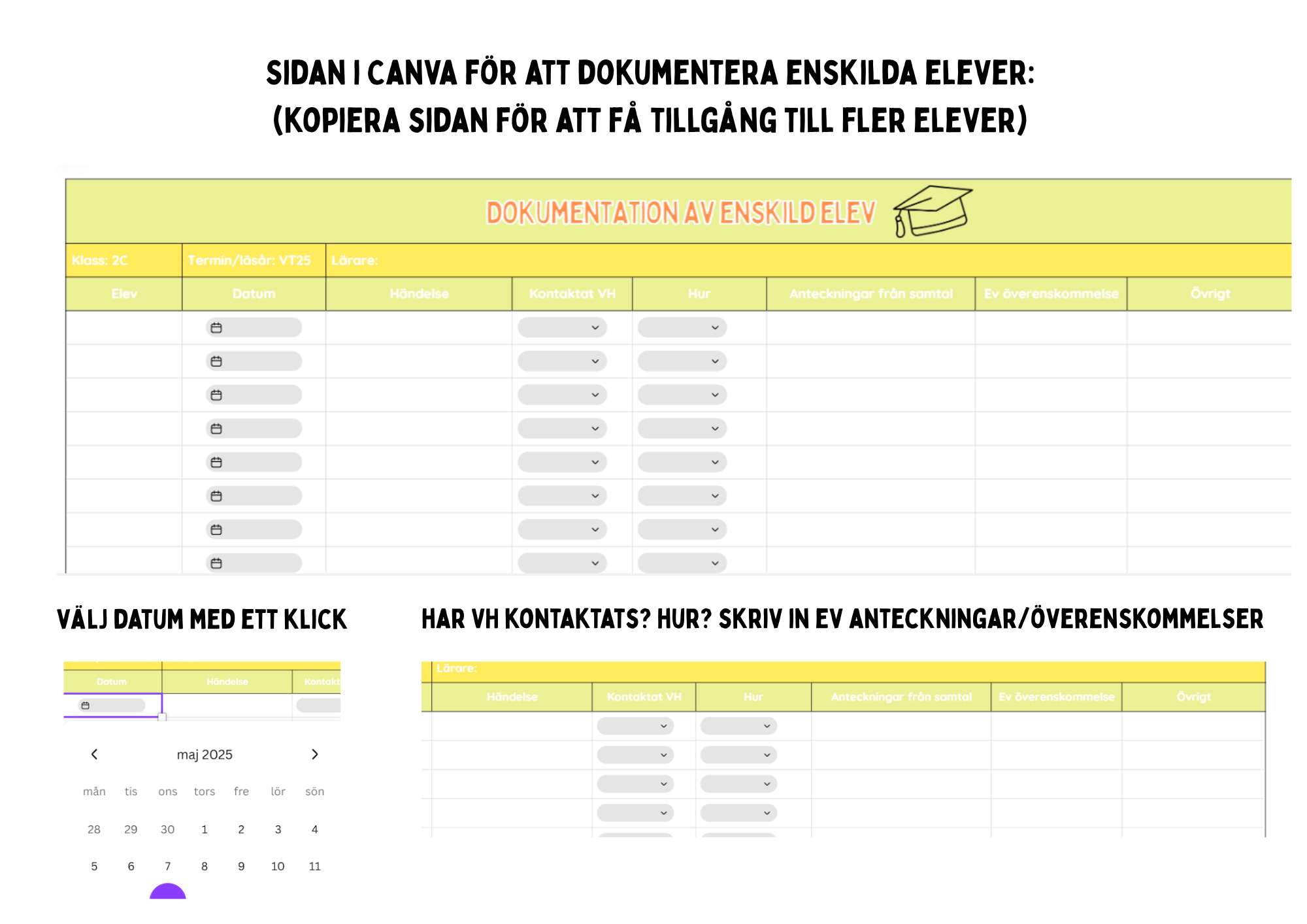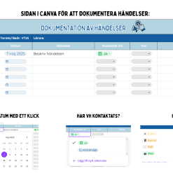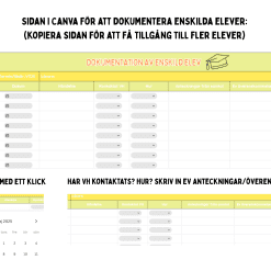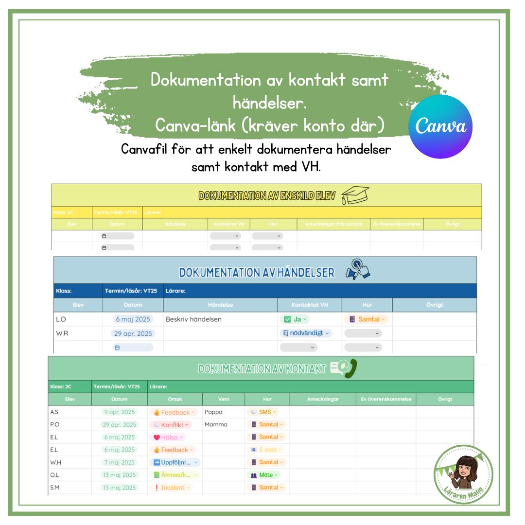 En mall för att enkelt kunna dokumentera händelser för elever samt dokumentera kontakten med VH. Även en sida för att dokumentera enskilda elever följer med. För att kunna få tillgång till denna fil krävs det att du har ett konto på Canva. När du köpt filen följer två PDF med, öppna PDf:erna och följ instruktionerna där. Det kommer finnas en länk till mallen där i ena filen. Viktigt att du klickar på ”använd mall i ny design”. Jag finns behjälplig för support om ni undrar något.