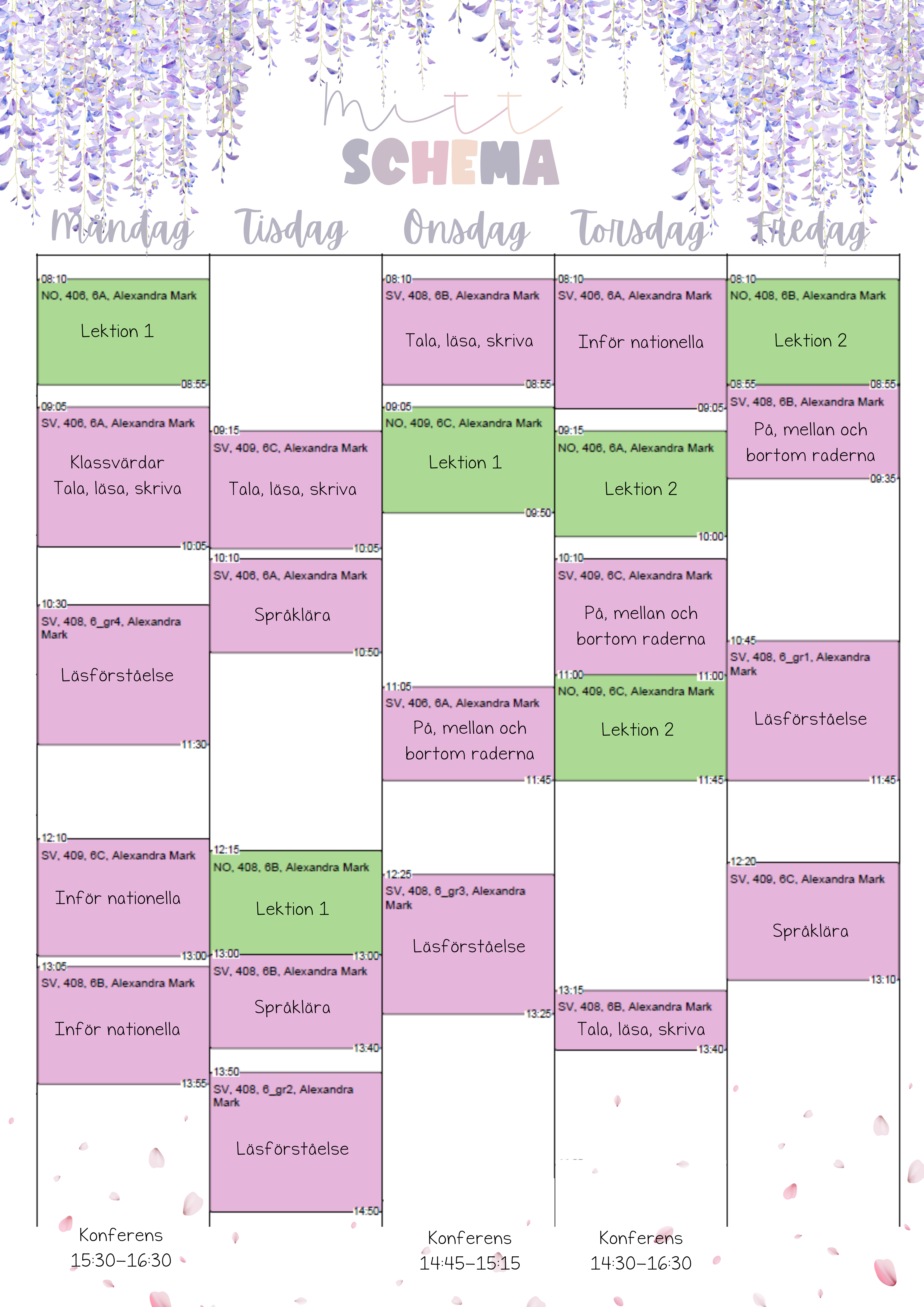 Gör ditt schema extra fint med denna mall! Bilden är i PNG-format vilket gör att du lätt kan infoga mallen i Power Point och sedan lägga till de lektioner du har, dag för dag. Bild två är ett exempel på hur det kan se ut när det är färdigt.