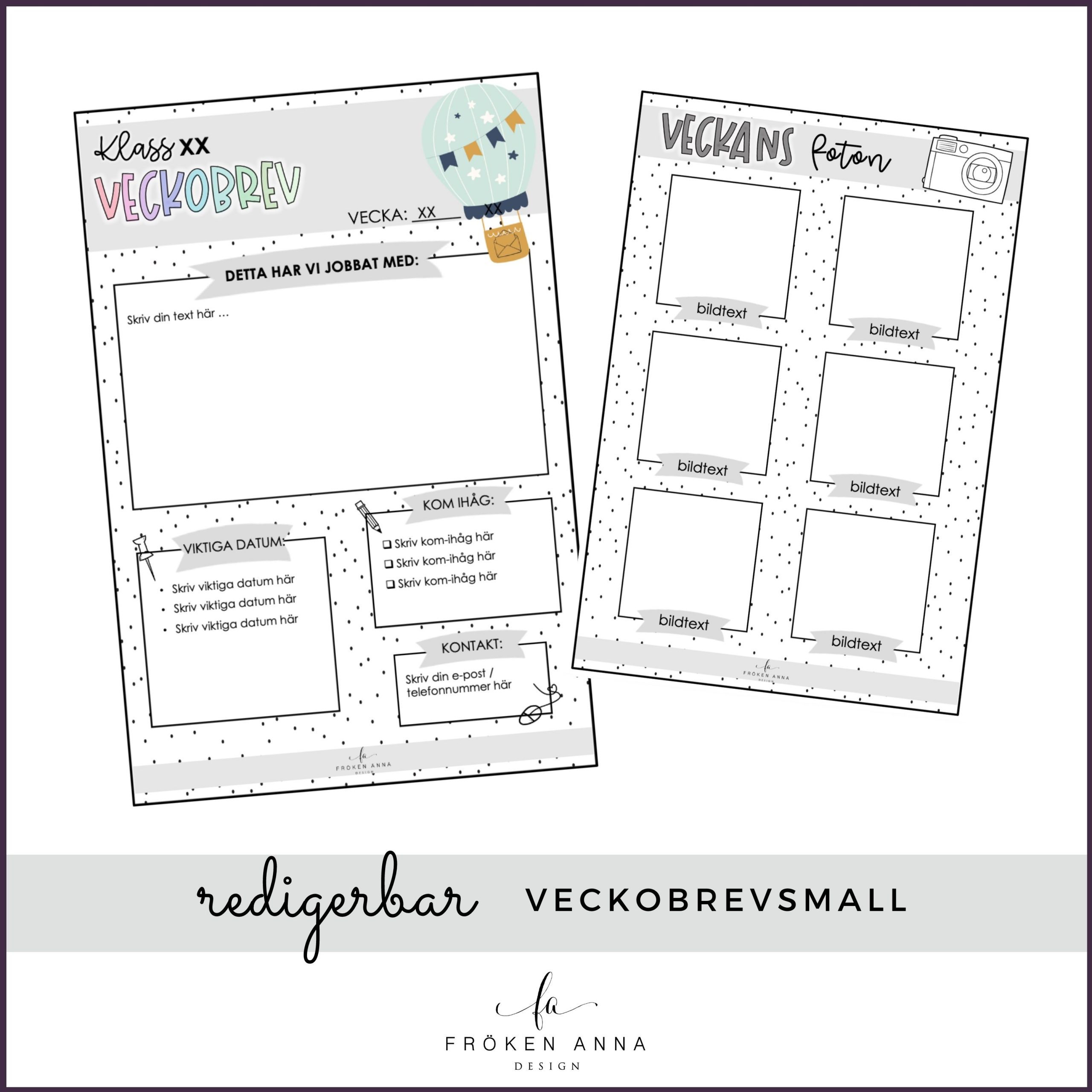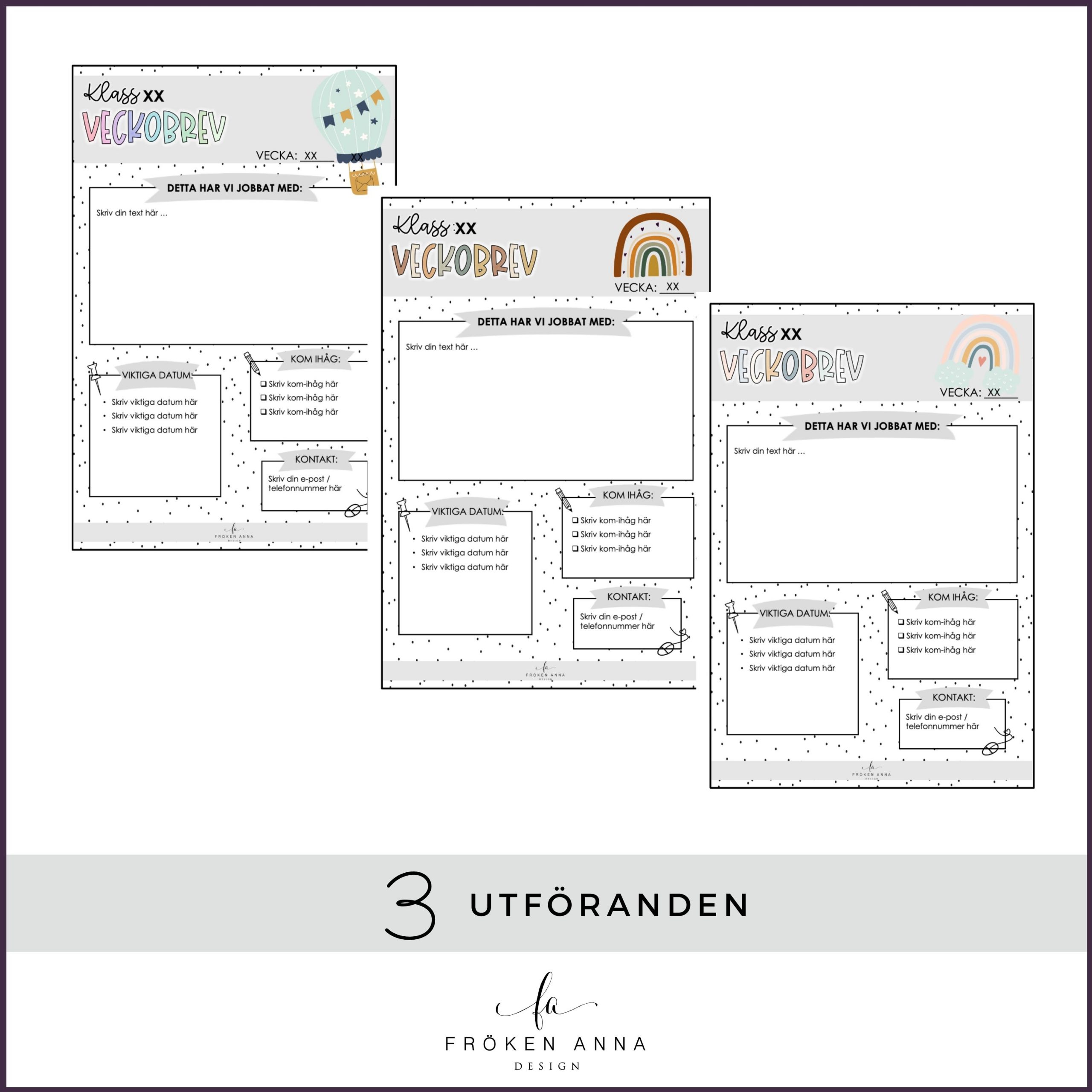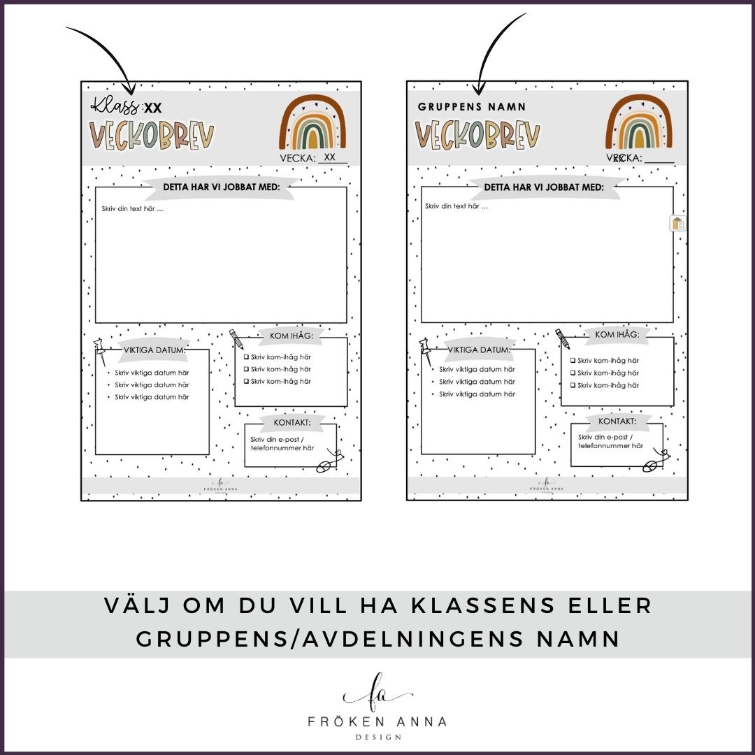 Redigerbar mall för veckobrev att skriva veckobrev till vårdnadshavare i. Totalt ingår sex olika utföranden samt två bilagor med plats för foton att välja på. Du kan välja på ”Klass” eller en helt tom rad om du t.ex. vill skriva avdelningens eller gruppens namn istället.
