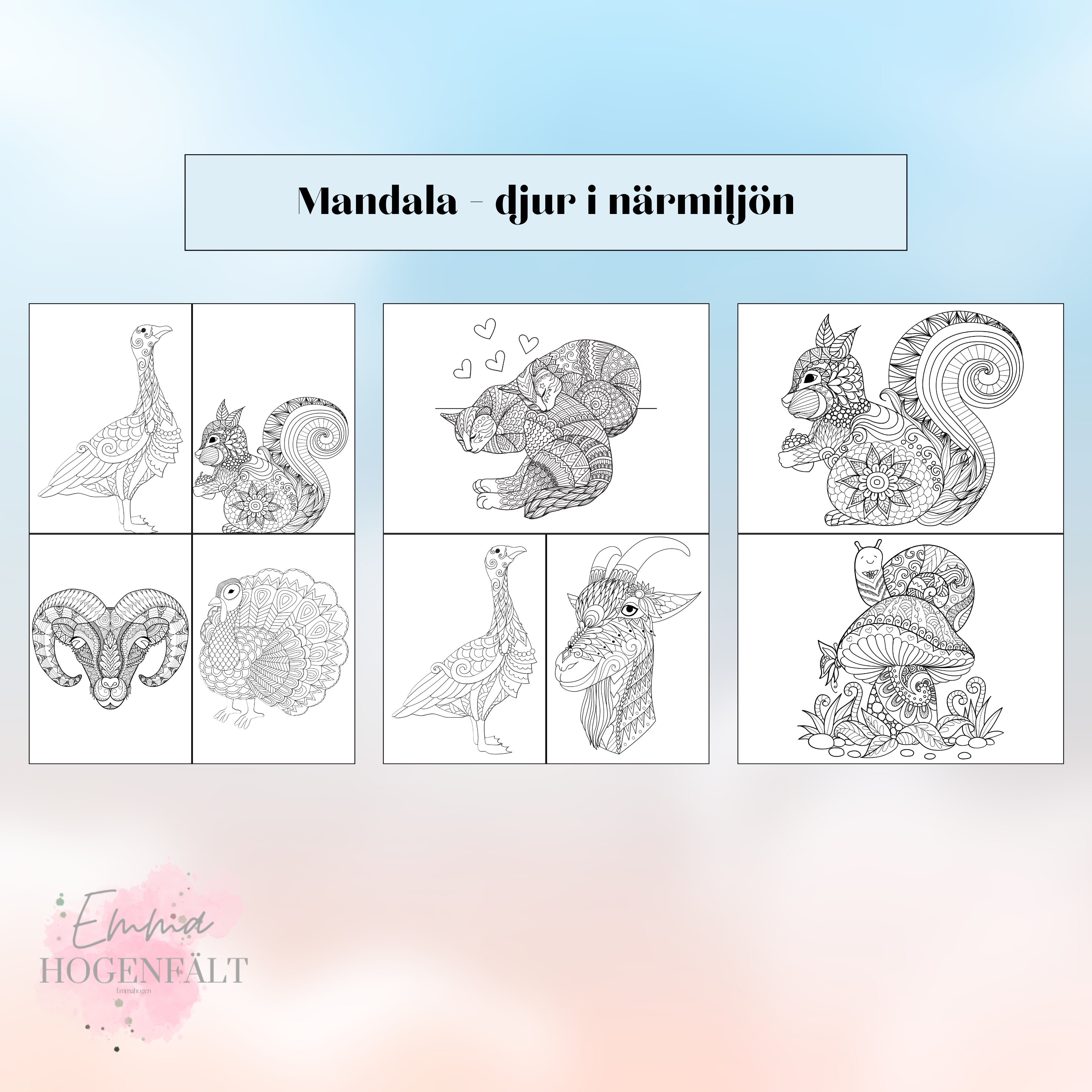 Totalt 11 a4 sidor med målarbilder/mandala med 4/3/2 bilder per a4 sida. Flera målarbilder per sida motverkar att eleverna springer och hämtar flera papper när de har målat färdigt en bild. Perfekt uppgift att pyssla med som startuppgift, vid sidan om np/kartläggningar eller liknande självständigt arbete.