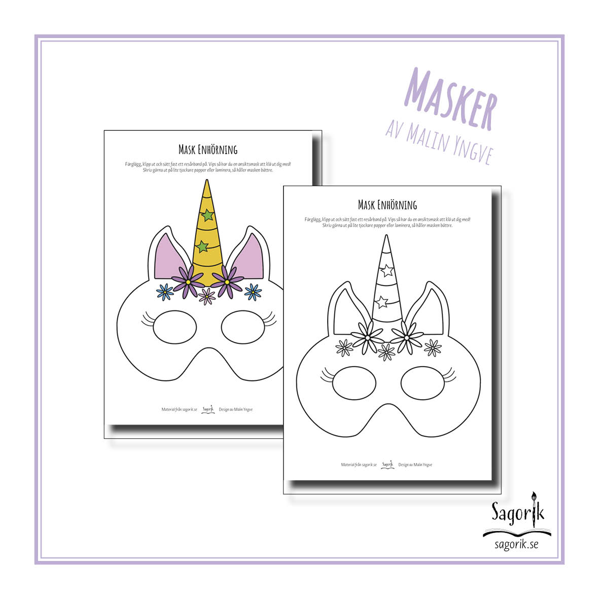 Mask Enhörning innehåller både en färglagd mask och en mask barnen själva kan färglägga.