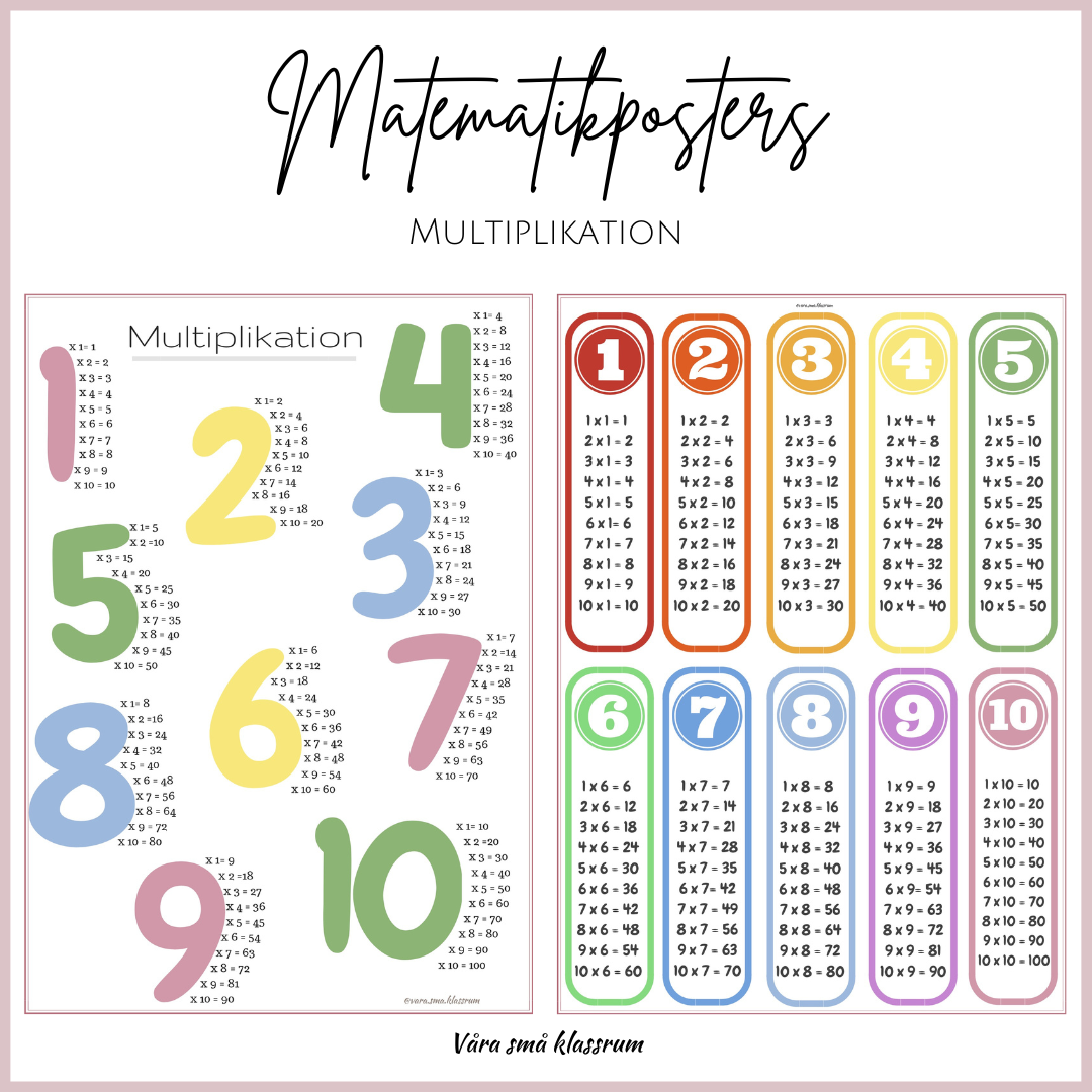 TvÄ stycken posters med multiplikationstabellerna 1-10.