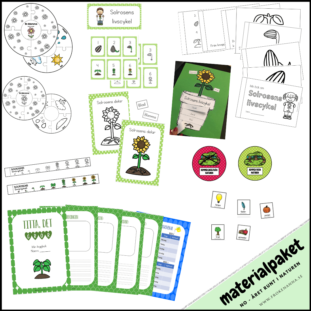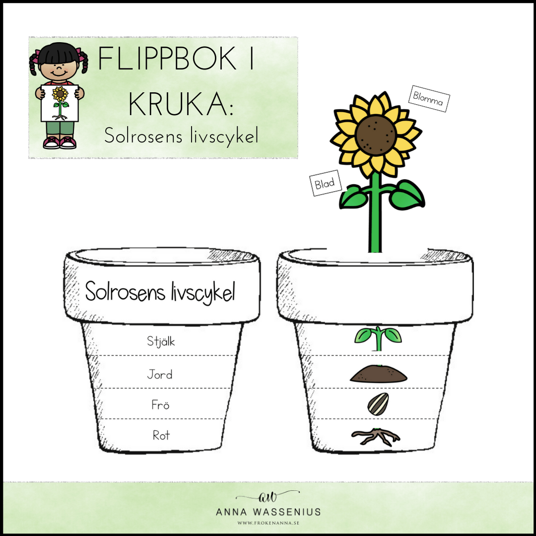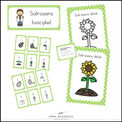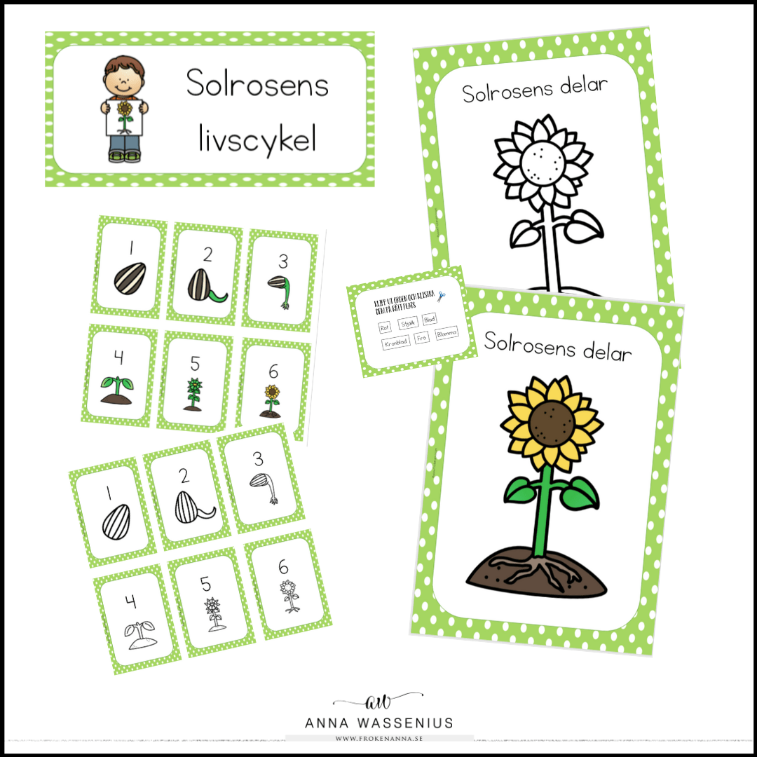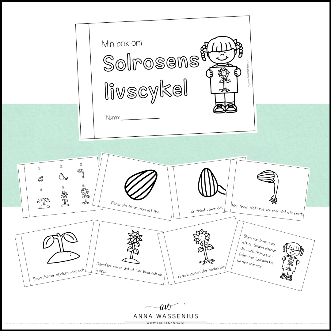- Min bok om solrosens livscykel – bok i färg och svartvitt där eleverna får läsa och skriva om processen från frö till blomma