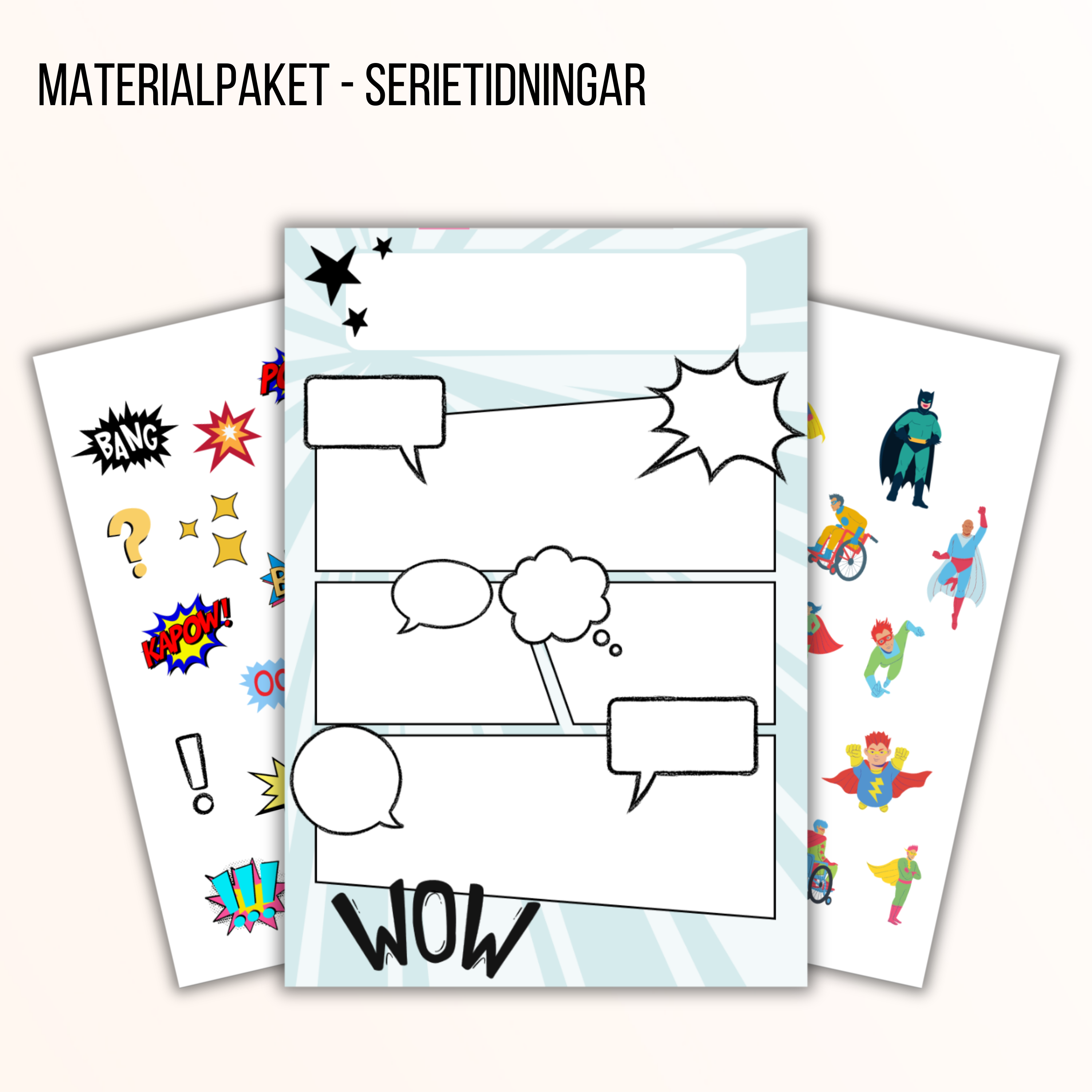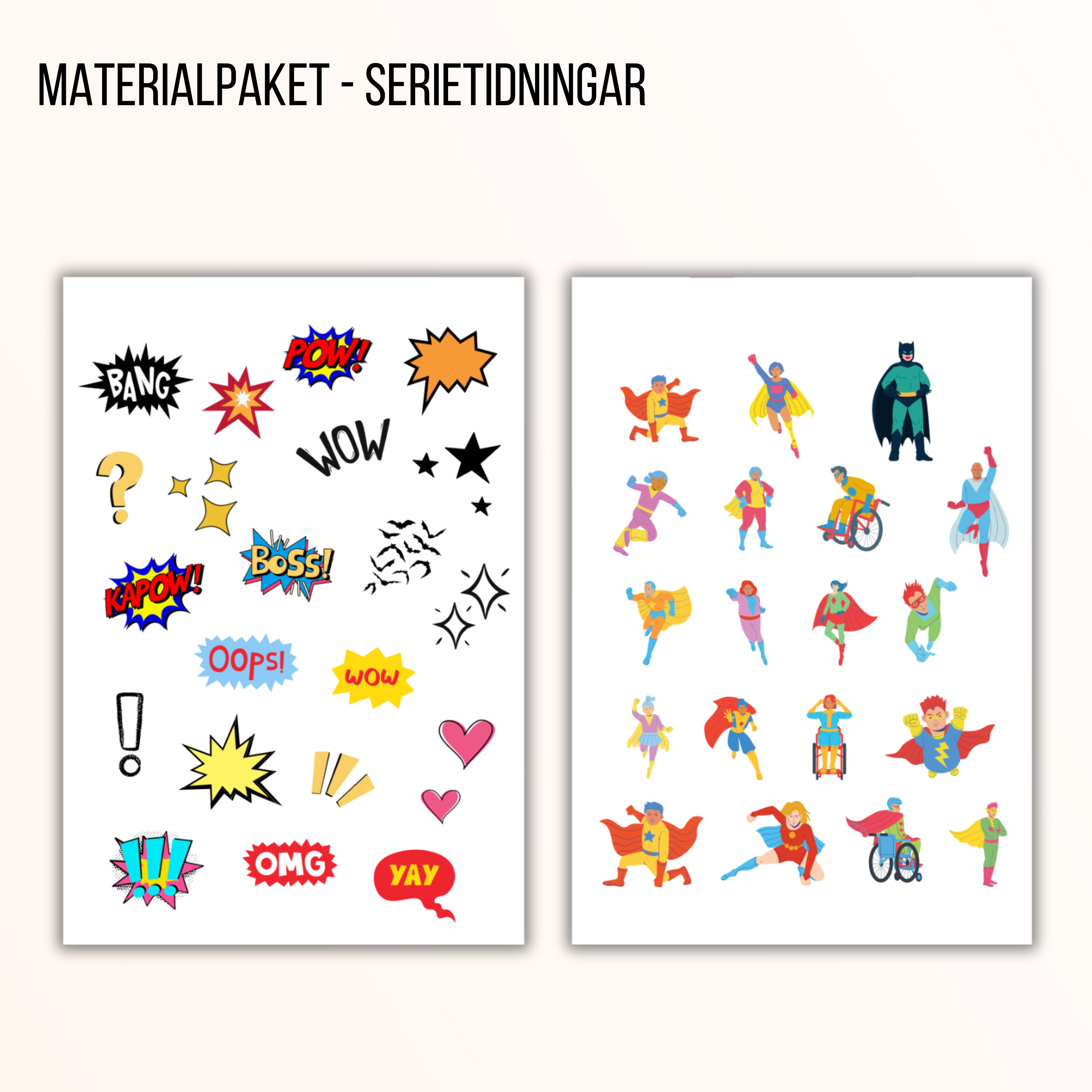 Materialpaket för att skapa egna serietidningar! Låt eleverna fylla i en färdig mall, eller klippa och klistra för att skapa sin egen. Med i paketet finns också clipart, men eleverna kan självklart rita själva.