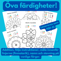 Matte – mandalas med enkel addition. Perfekta som extrauppgifter! Kommer som PDF-fil med 6 motiv. Öppnar upp för att träna på flera förmågor samtidigt! Matematik (addition), måla inom linjerna (finmotoriken), följa instruktioner (rätt färg på rätt plats), samt bra språkträning med namn på enkla färger. Passar då även bra till elever med annat modersmål!