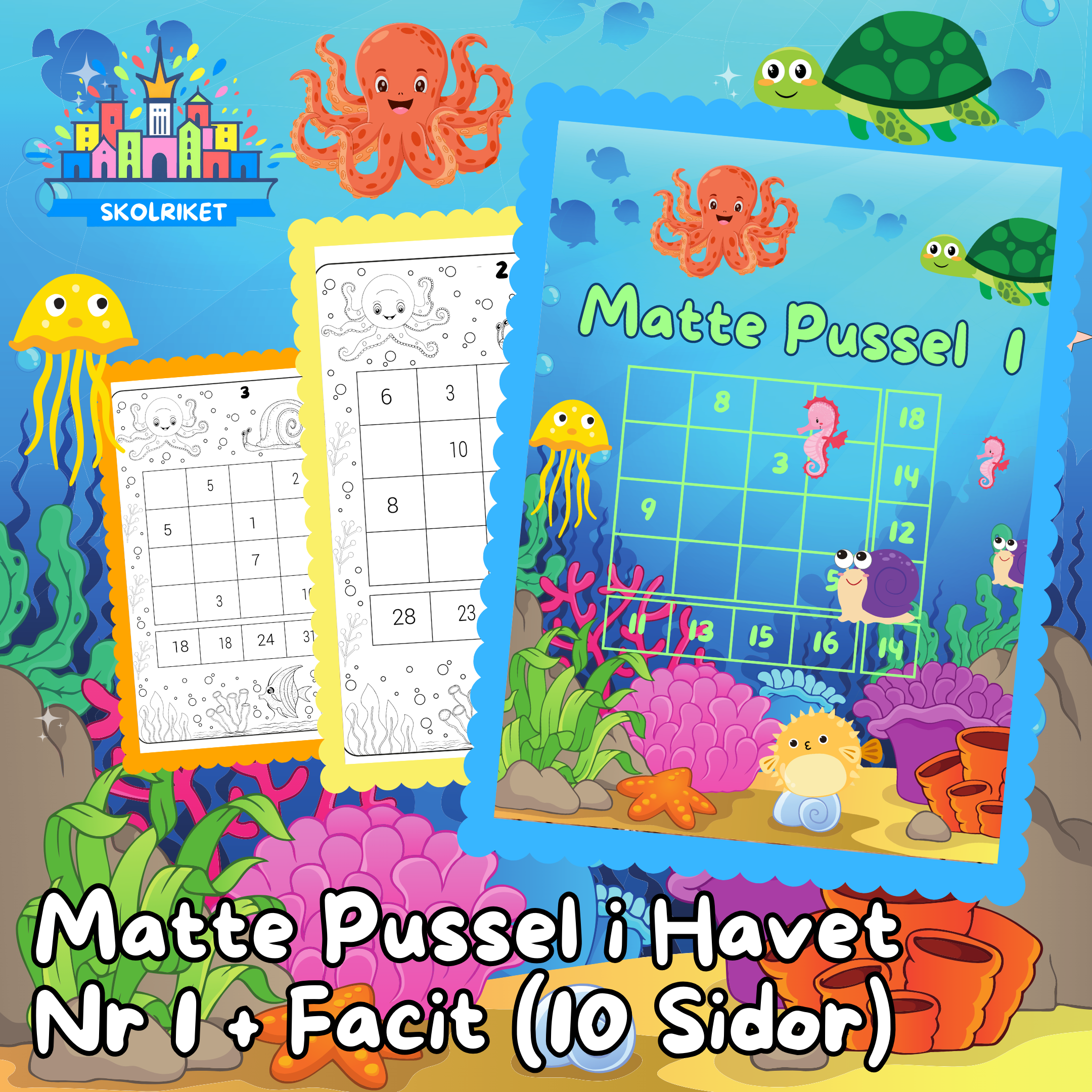 10 sidor med kluriga matte pussel med havet som tema, inkluderar facit för varje pussel. Här får man fylla i de saknade siffrorna som är heltal mellan 1 till 10. Siffrorna på varje rad adderas till totalsummorna till höger. Siffrorna i varje kolumn summerar till totalsummorna längst ner. De diagonala linjerna summerar också till totalsummorna till höger.
