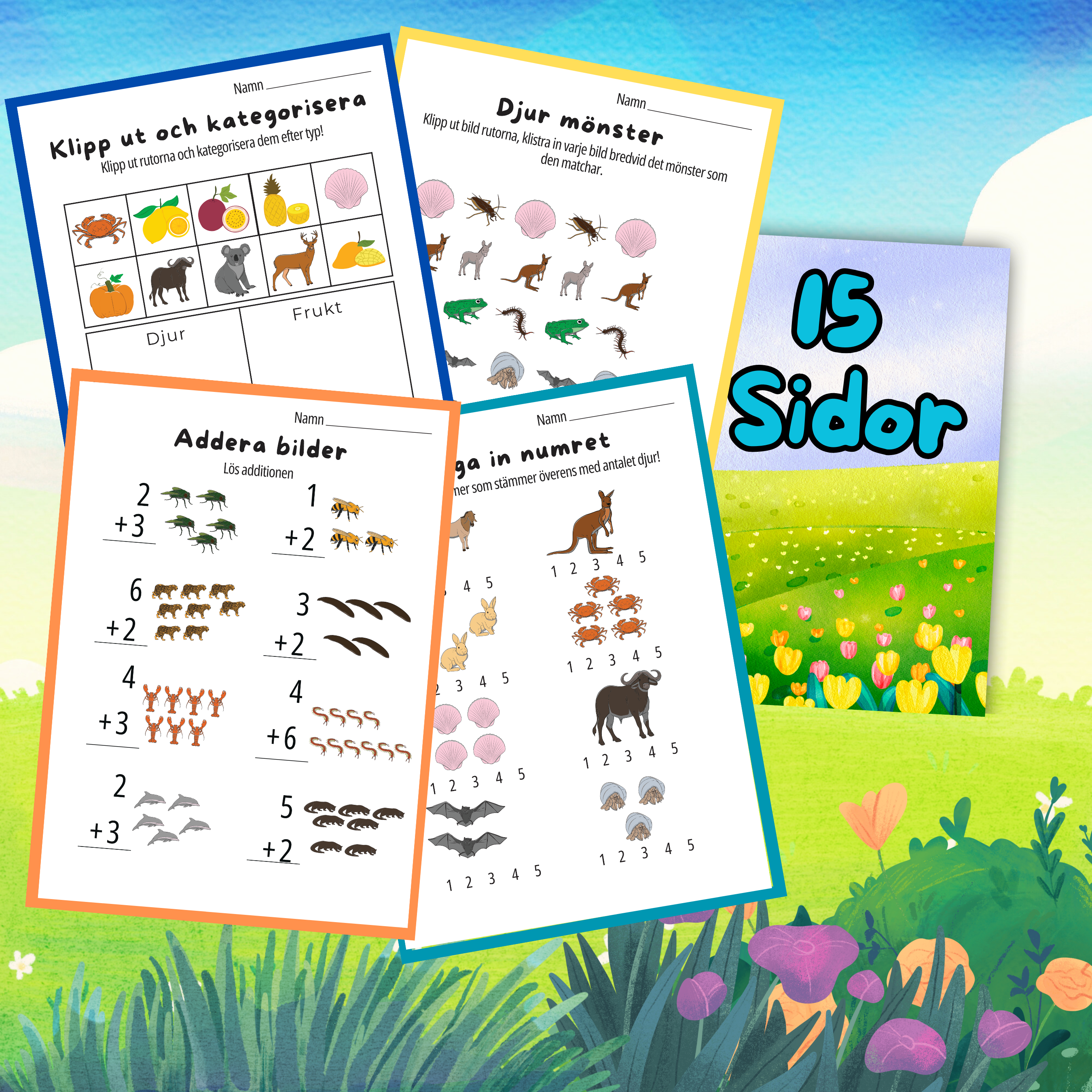 15 sidor med olika enklare övningar och matte problem att lösa. Man får matcha skuggor, spåra linjer, räkna och matcha nummer, kategorisera, klura ut mönster, addera och subtrahera samt räkna ihop.