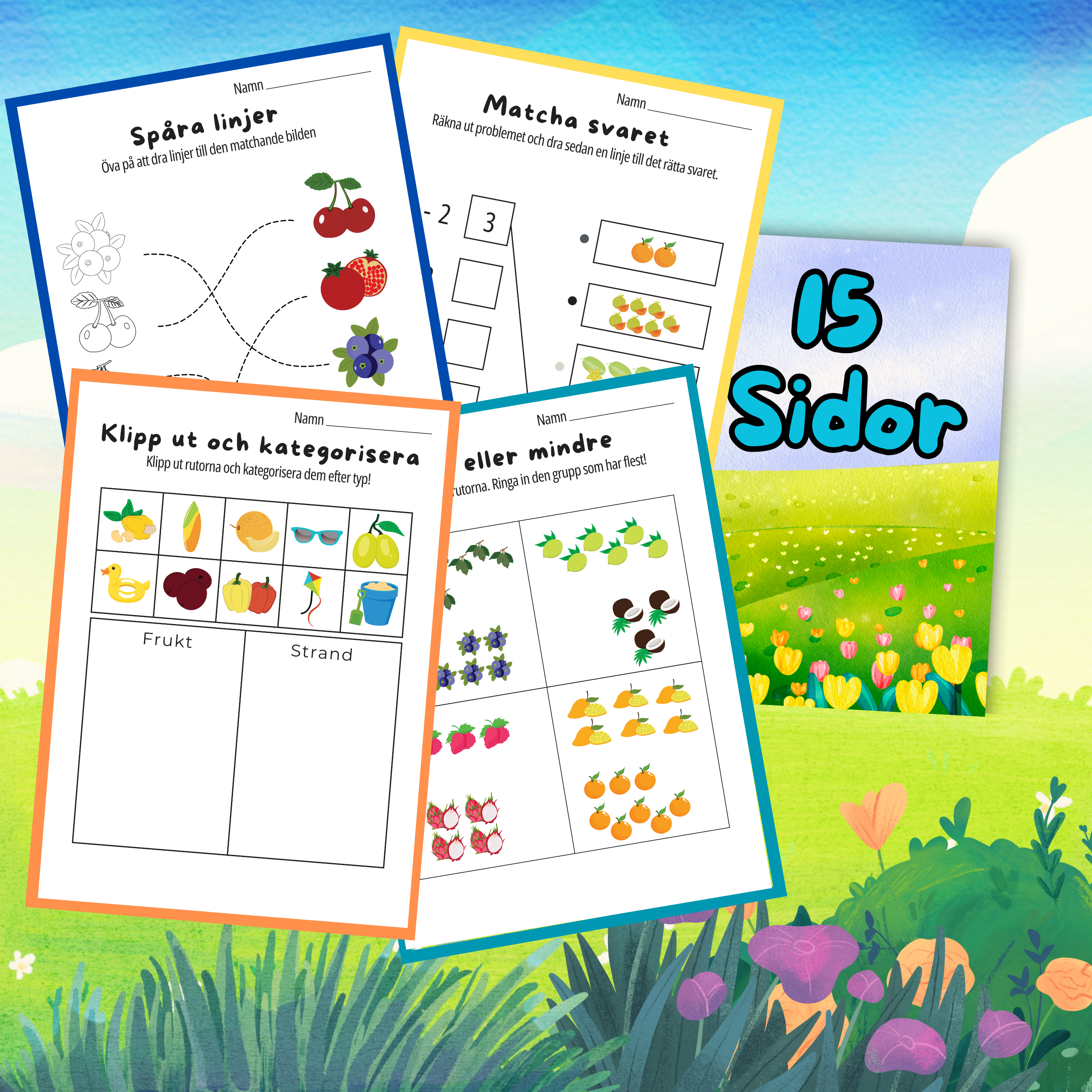 15 sidor med olika enklare övningar och matte problem att lösa. Man får matcha skuggor, spåra linjer, räkna och matcha nummer, kategorisera, klura ut mönster, addera och subtrahera samt räkna ihop.