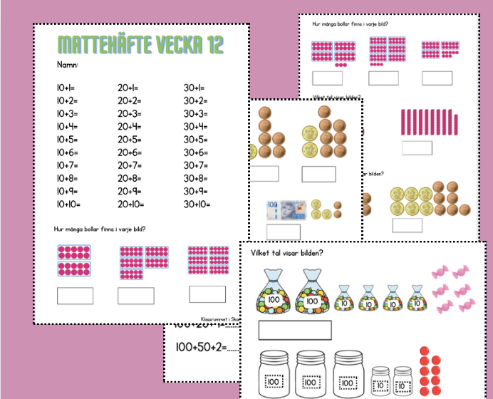 Mattehäfte vecka 12; kan användas som arbetshäfte eller veckoläxa. Tränar positionssystemet ental, tiotal och hundratal. Senast slutet av varje vecka publicerar jag ett nytt häfte för kommande vecka.