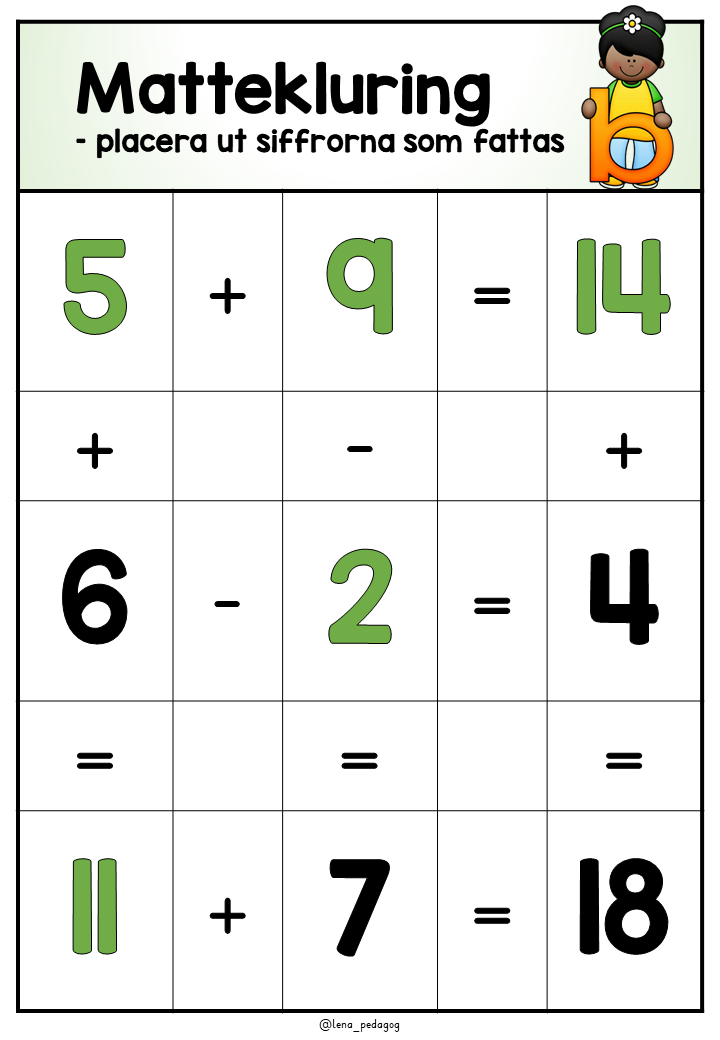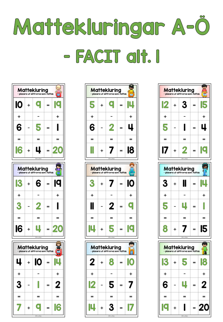 29 mattekluringar med addition och subtraktion + 2 sorters facit + sifferkort 1-20.