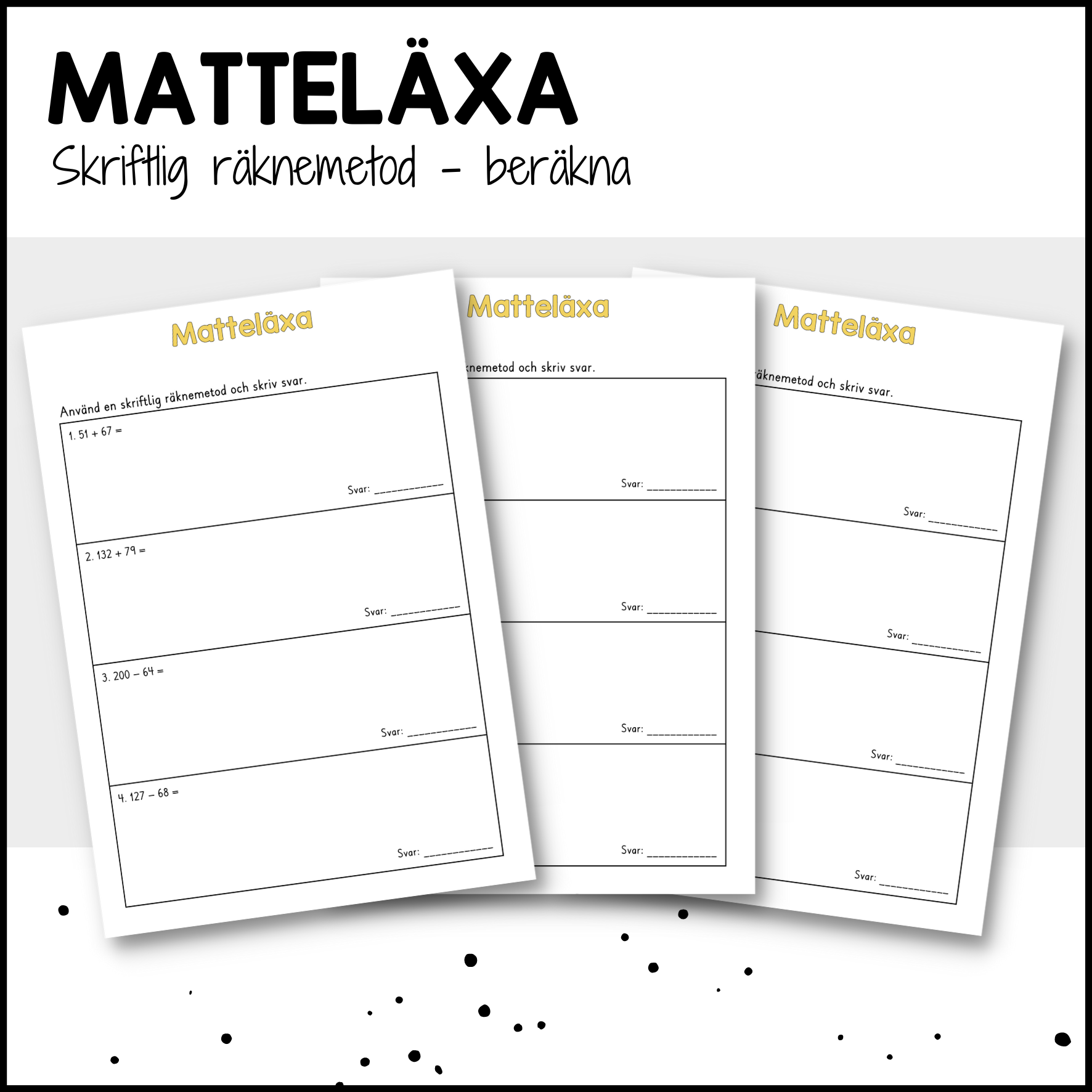 Tre arbetsblad att använda som matteläxa för att träna på skriftlig räknemetod. Perfekt inför nationella proven i åk 3.