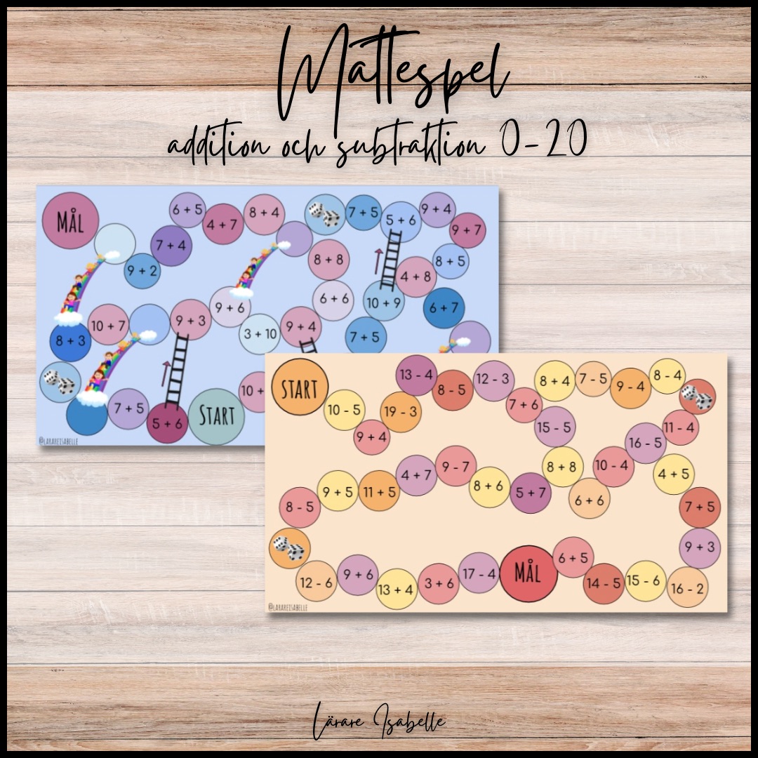 Två mattespel med fokus på addition och subtraktion inom talområdet 0-20. Ett spel är blandat med addition och subtraktion och det andra spelet är enbart addition.