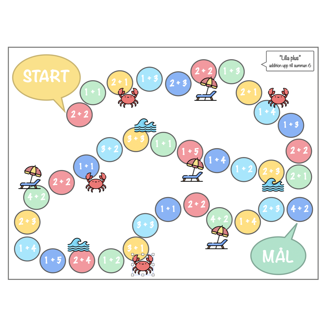 Med detta mattespel kan eleverna träna enkel addition där summan hamnar mellan 1-6. I spelet finns tal som 2+3, 1+5, 2+1 osv.