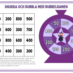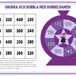Gör så här: Spela med en kompis. Sätt fast ett gem i mitten med en penna. Snurra gemet. De tal som gemet stannar på dubblar du. Markera talet på spelplanen med en plockis eller kryssa för. Är rutan upptagen går turen över. Den som först får fyra i rad vinner, eller den som har flest kryss när spelet är slut vinner. Eleverna kan också ha varsin spelplan. Laminera och använd med fördel whiteboard-pennor så kan spelet användas om och om igen.