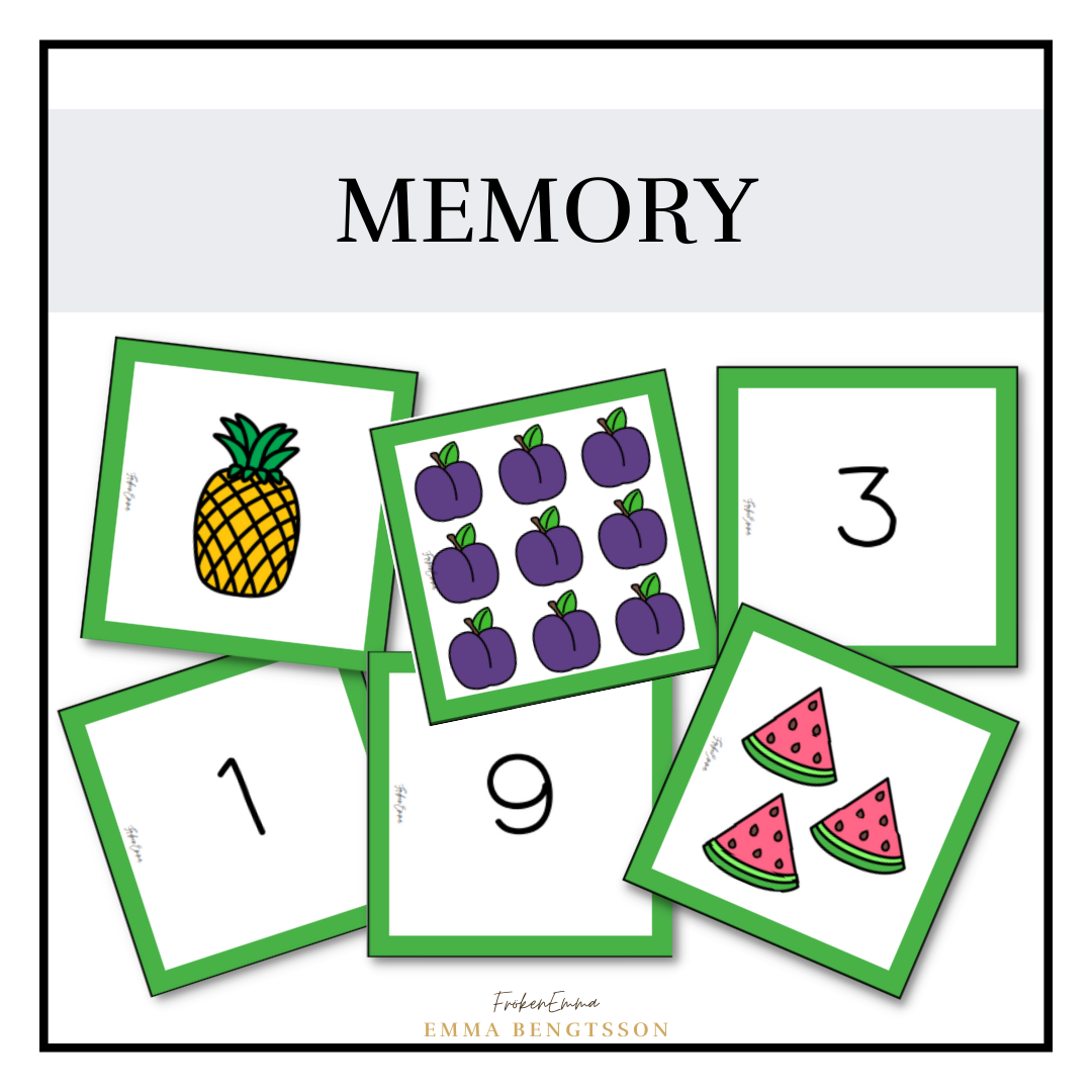 Memory med talområdet 0-10. Para ihop rätt siffra med antal frukter.