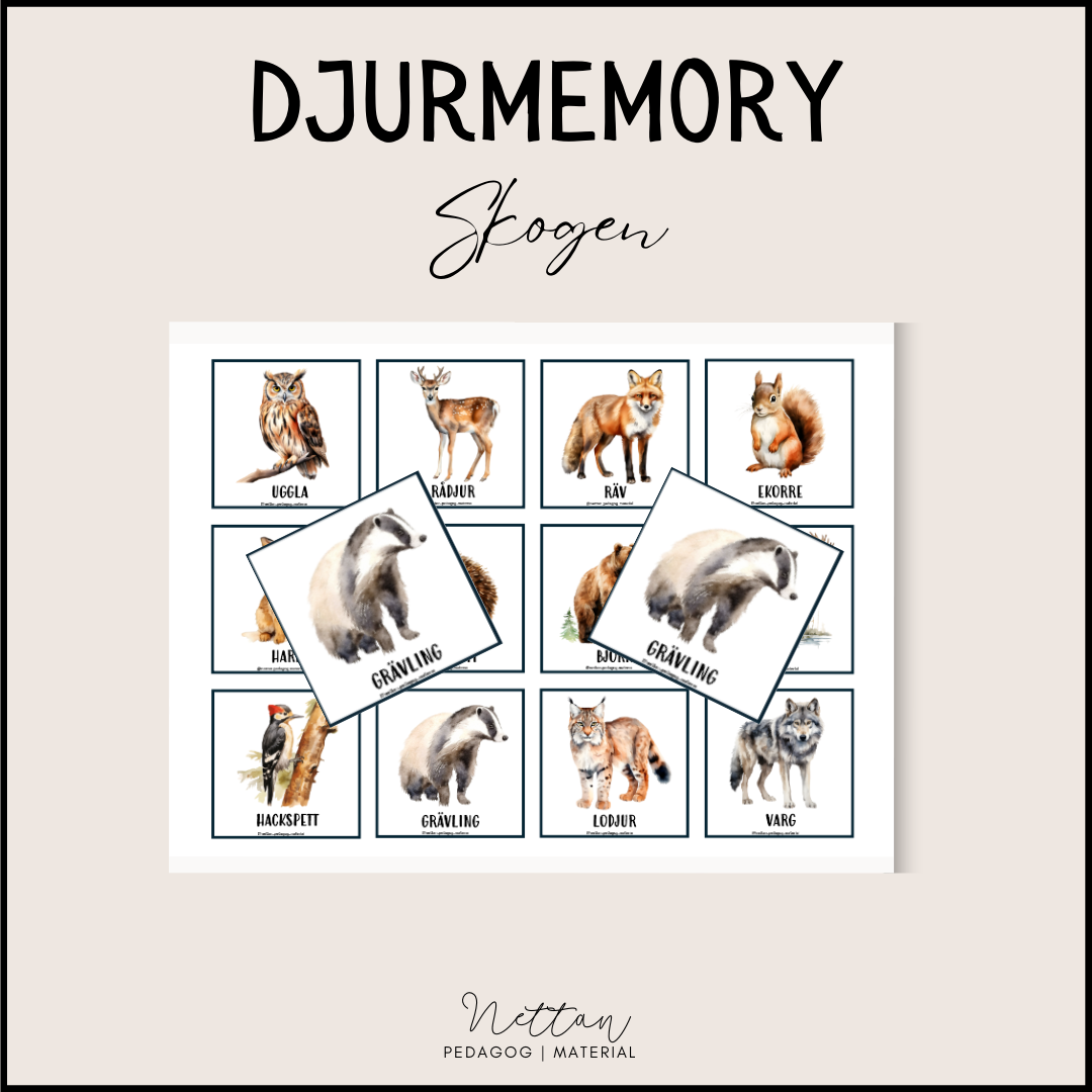 Innehåller 12 kort med djur i skogen. Skriv ut sidan två gånger för att använda som memory. Om man vill ha fler kort kan man använda tillsammans med djurmemory från bondgården, savannen eller Arktis.