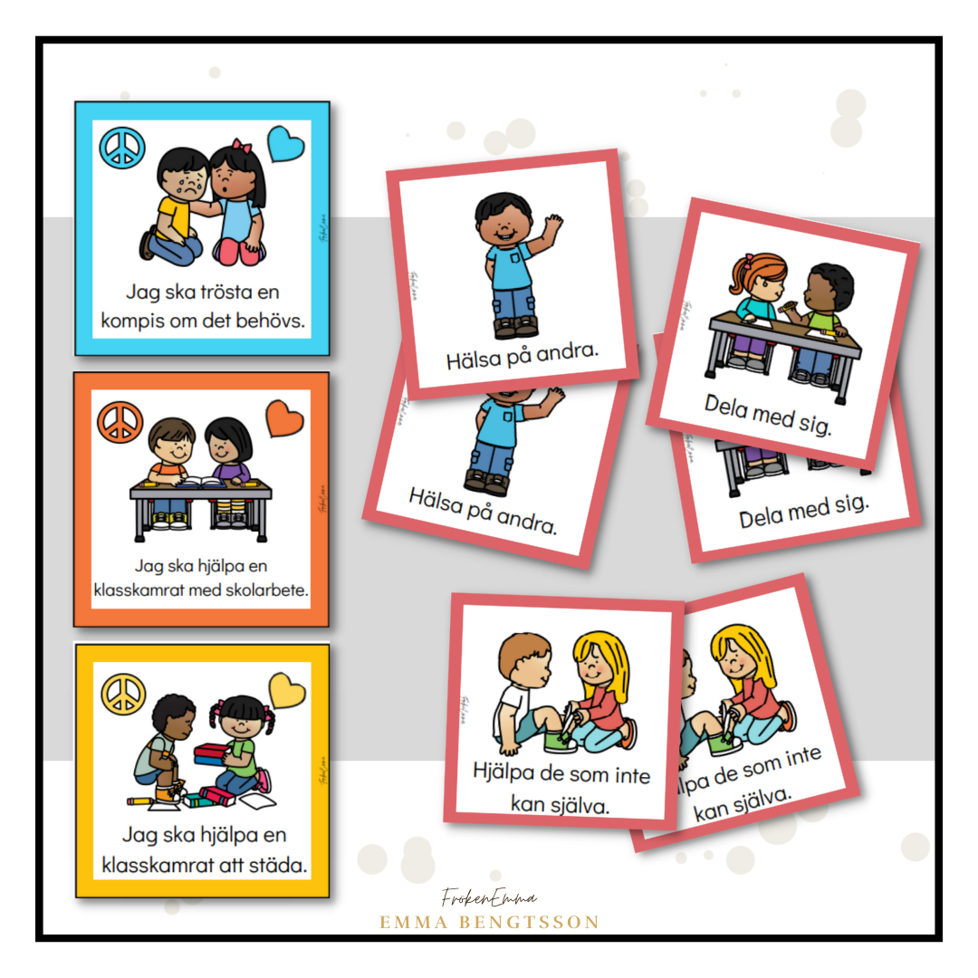 Memory och uppdragskort som har temat ”vänliga handlingar”. Kan passa bra till vänliga veckan / alla hjärtans dag. Arbeta aktivt med korten under vänliga veckan eller varför inte ha veckans vänliga uppdrag i klassen? Ha ett gemensamt uppdrag varje vecka eller dela ut ett eget till varje elev som de ska träna extra på under en vecka.