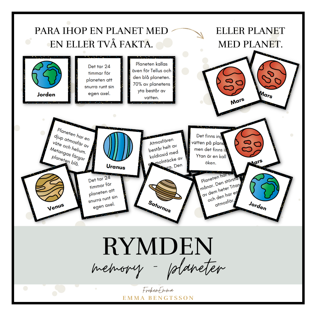Arbeta med rymden. Kolla elevernas kunskaper om planeterna i vårt solsystem med hjälp av att spela memory! Ett enkelt och roligt sätt att kolla av kunskaperna. I materialet finns det ett kort som visar planet med namn (för alla planeter) samt två faktakort till varje planet. Para ihop en planet med en fakta eller två fakta. För de mindre eleverna kan de para ihop planet med planet.