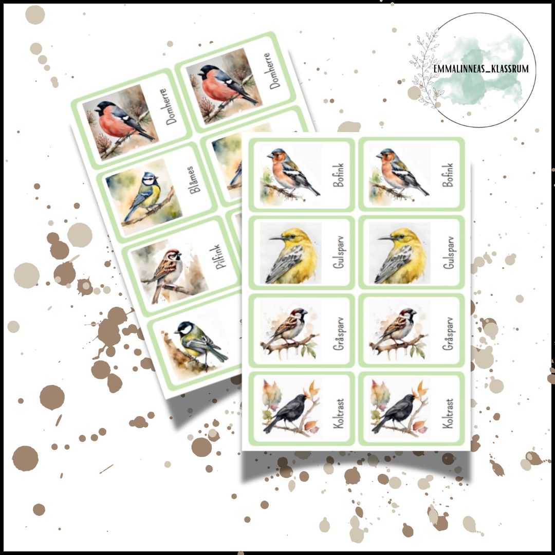 Memory med 36 vanligt förekommande svenska fåglar, totalt 72 memorybrickor.