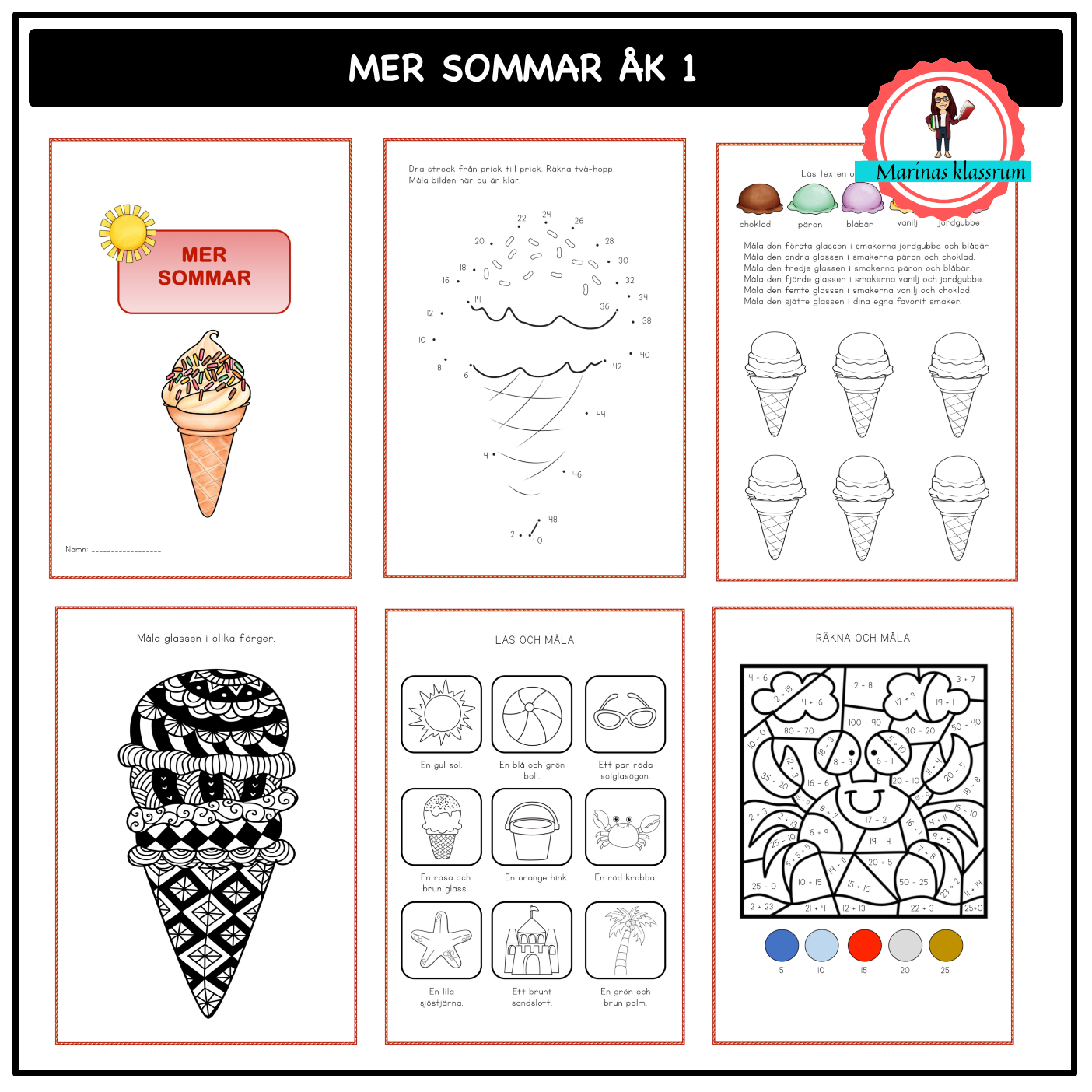Eleverna övar på: olika läs och måla, måla och beskriv en favoritglass, dra streck från prick till prick med 2-hopp, räkna och måla + och -, göra en egen räkna och målarbild och färglägg en mandala-bild med en glass.