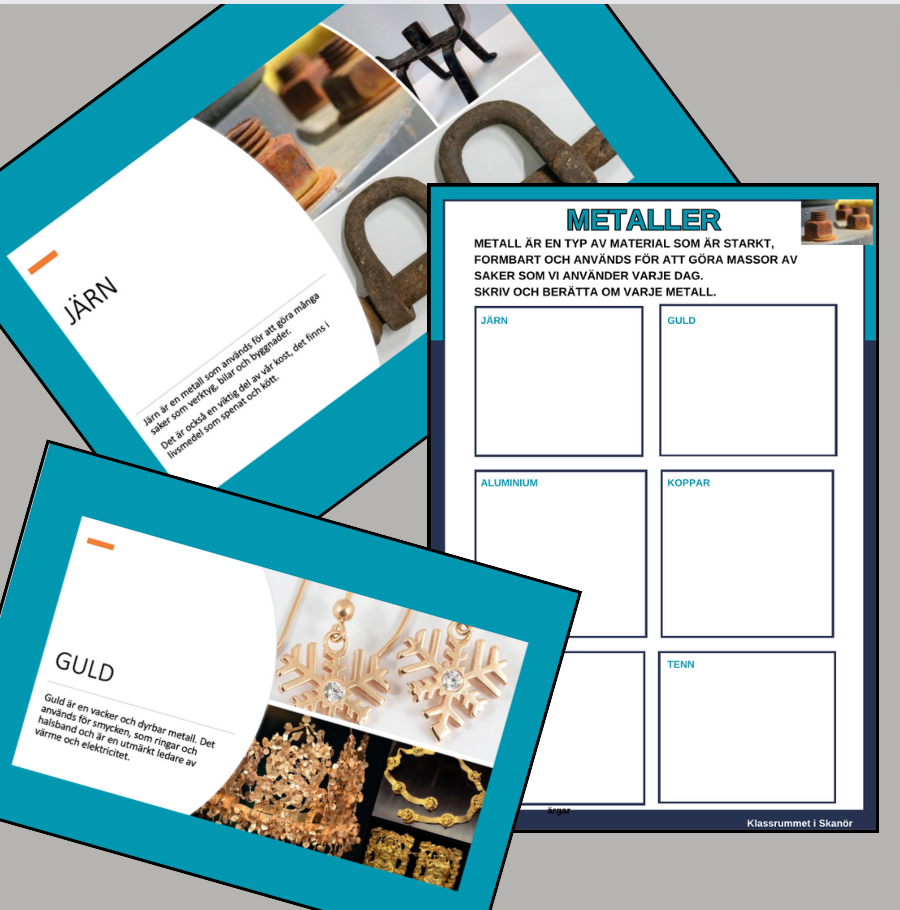 Fakta och arbetsblad om metaller; järn, guld, silver, koppar, aluminium och tenn.