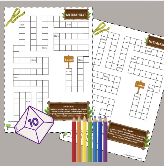 Spelarna behöver varsin spelplan, en 10 sidig tärning och färgpennor. Slå tärningen och färglägg så många centimetrar som tärningen visar. Först till en meter vinner.