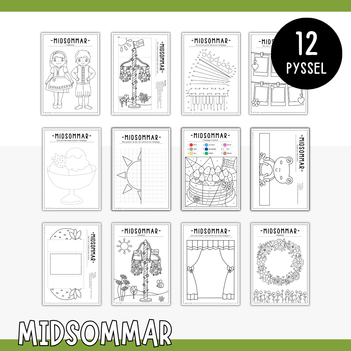Pysselpaket med 12 pyssel till midsommar. Innehåller bland annat målarbilder, öppningsbara kort, rita klart bilder, följ linjer, rita minnen och färglägg med kod.
