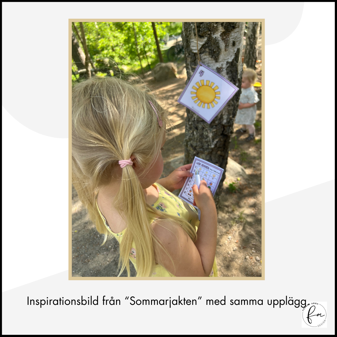 Häng upp en snitslad bana likt en tipspromenad eller göm de åtta motiven ute eller inne. Sätt antingen upp bilderna så att motivet syns eller limma fast det tomma pappret ovanpå och använd t.ex. mobillampan för att lysa bakom för att se motivet träda fram.