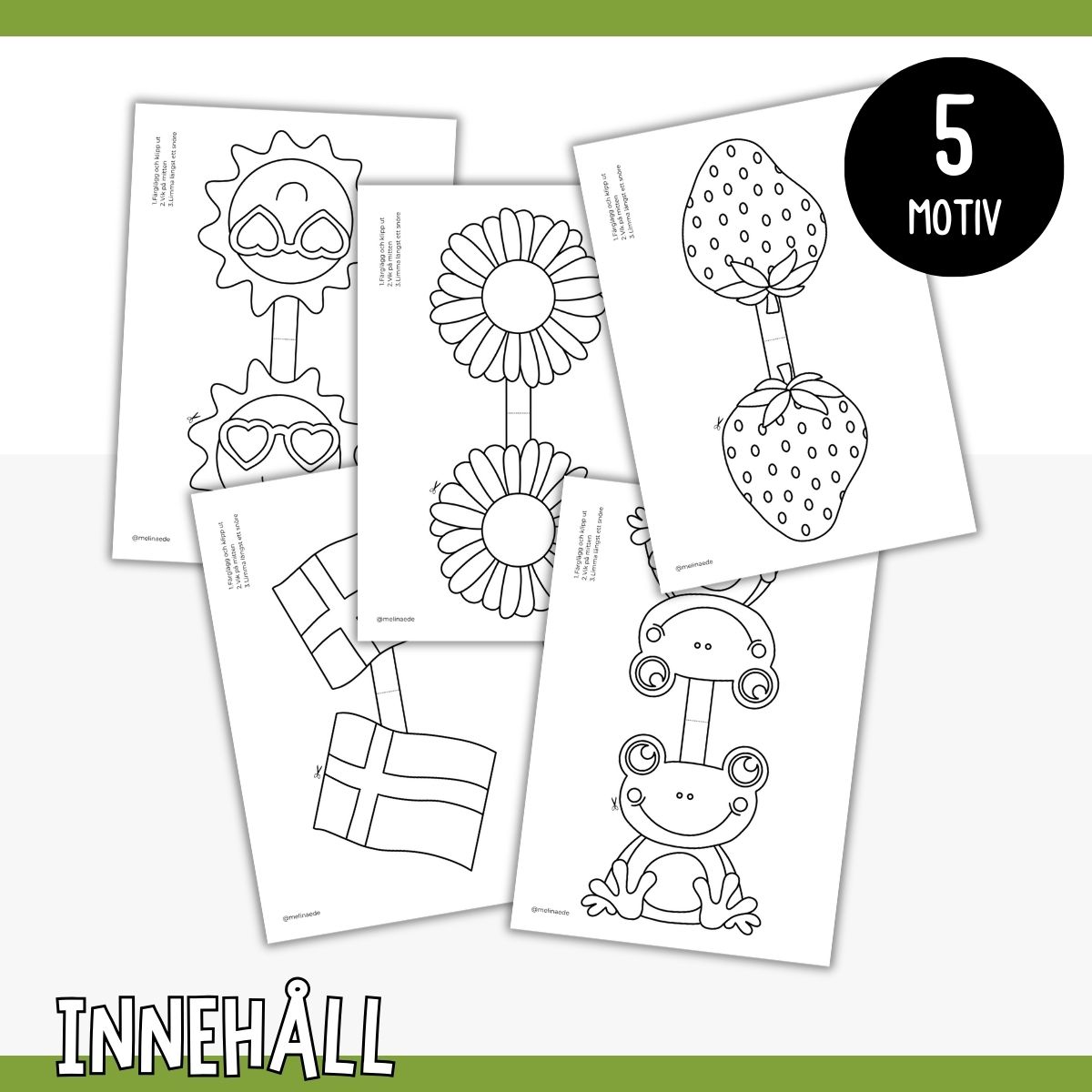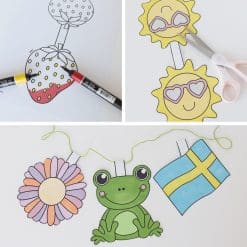 Mallar för att pyssla en girlang till midsommar. Klipp ut figurerna och vik remsan på mitten. Limma fast runt en tråd. Innehåller fem motiv: Sveriges flagga, blomma, sol, jordgubbe och groda.