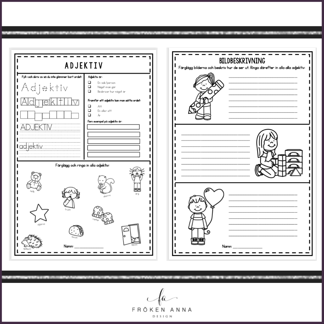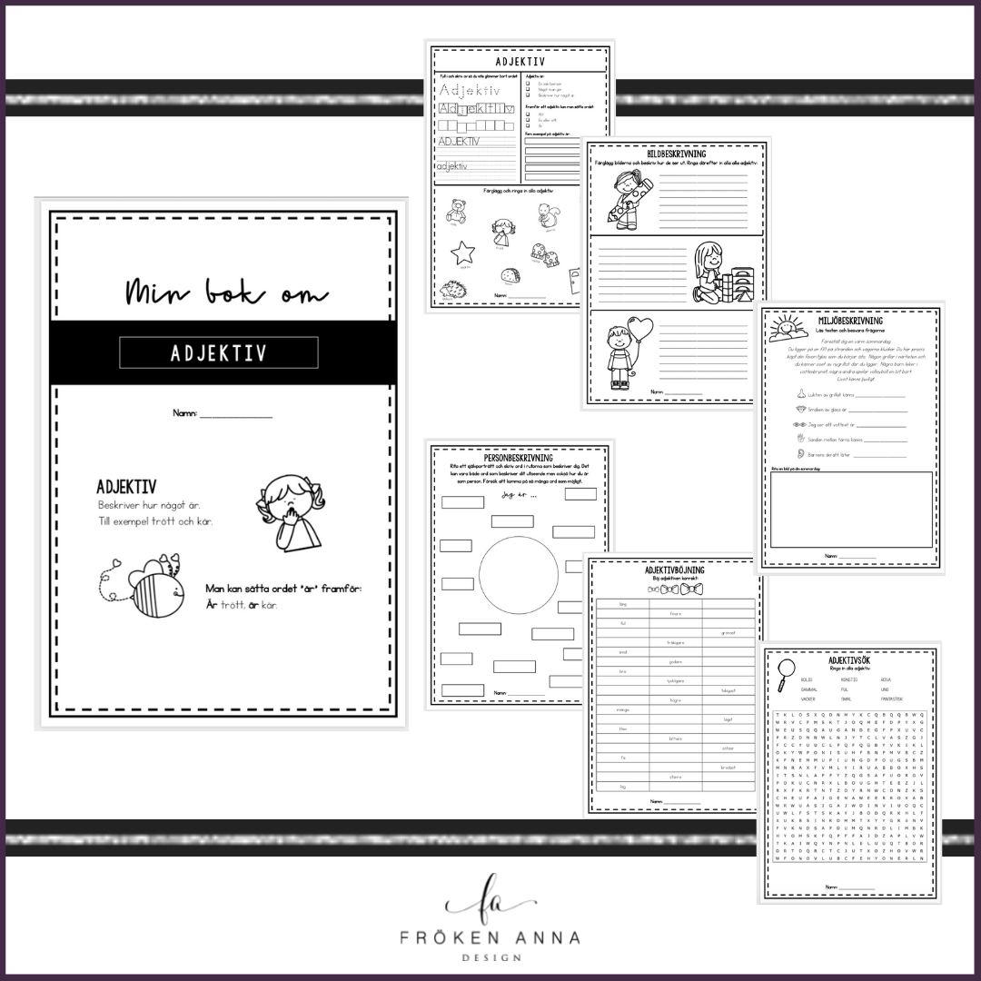 I detta material får eleverna fördjupa sina kunskaper om ordklassen adjektiv utifrån sex olika arbetsblad:
