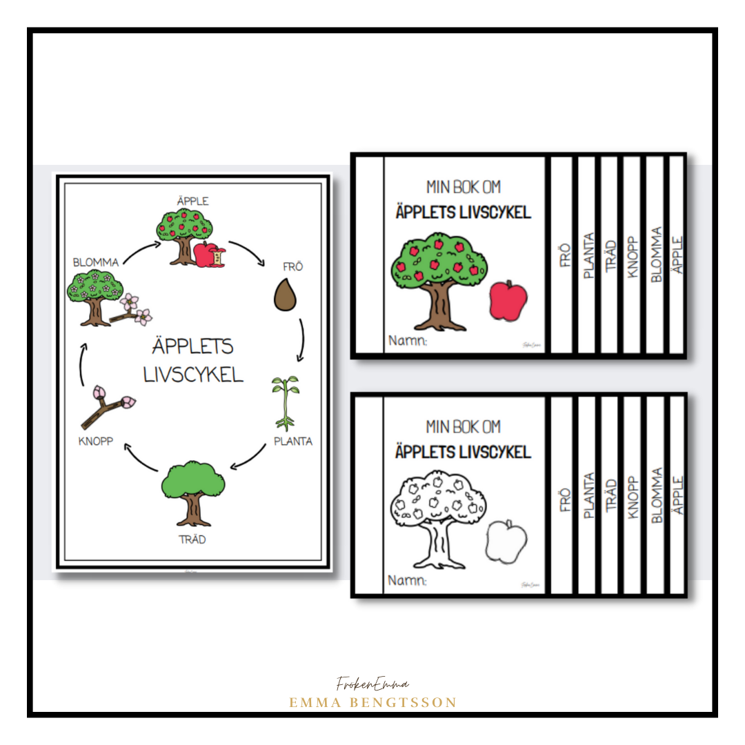 Skapa en egen faktabok / flippbok om äpplets livscykel. En bok att klippa ut, häfta ihop och fylla i själv. Tre varianter av samma bok i materialet. Materialet innehåller en bok med färdiga bilder i både färg och svartvitt som man kan skriva till och en bok med tomma rutor där man kan rita egna bilder.