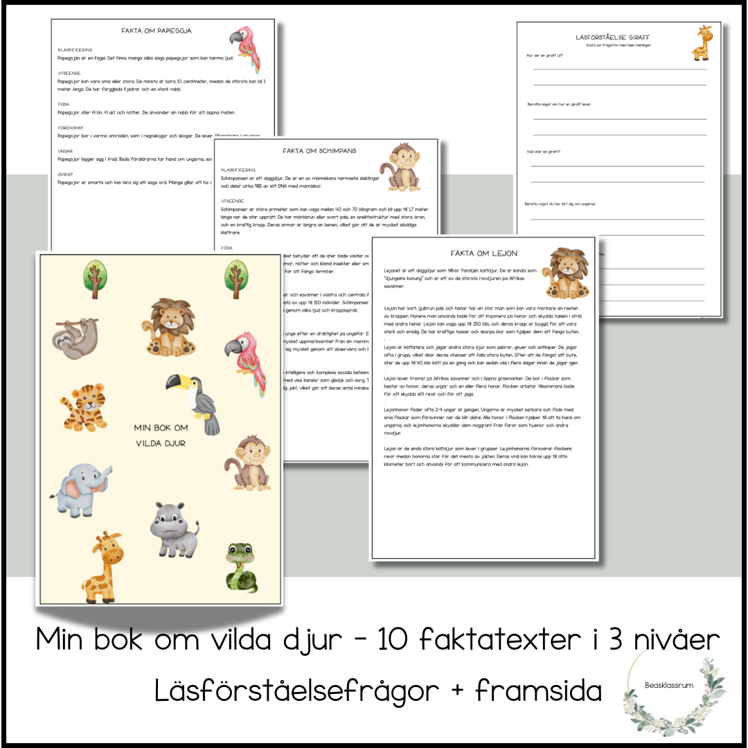 Till varje djur finns förutom faktatexterna även 1 sida med läsförståelsefrågor.