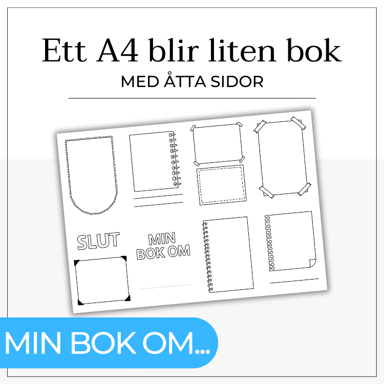 Gör en bok om valfritt ämne. Rita, skriv och berätta. Ett A4-papper viks och klipps till en bok med åtta sidor (instruktion medföljer).