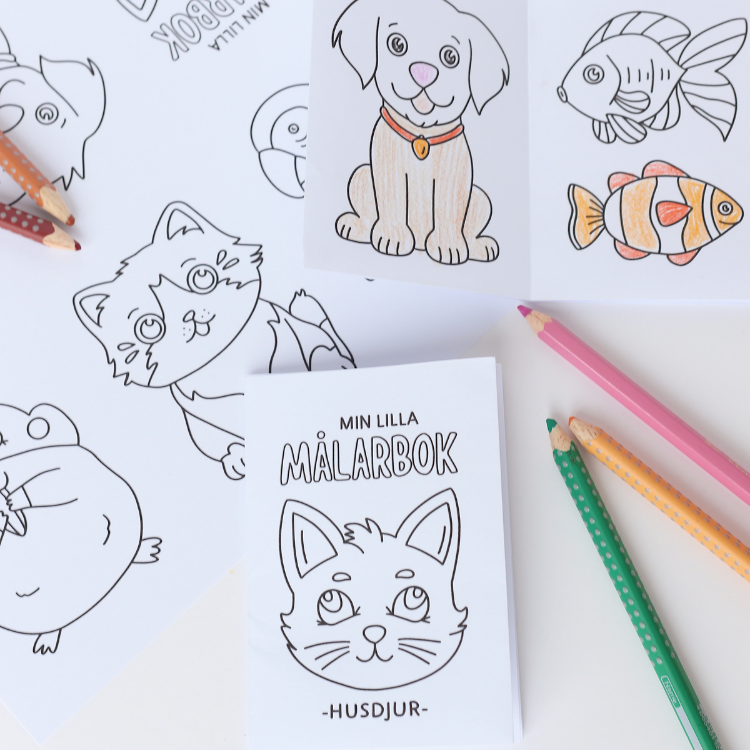 Min lilla målarbok tema husdjur. Ett A4-papper viks och klipps till en bok med åtta sidor. En målarbild att färglägga på varje sida. Instruktion på hur du viker medföljer (video och bild).