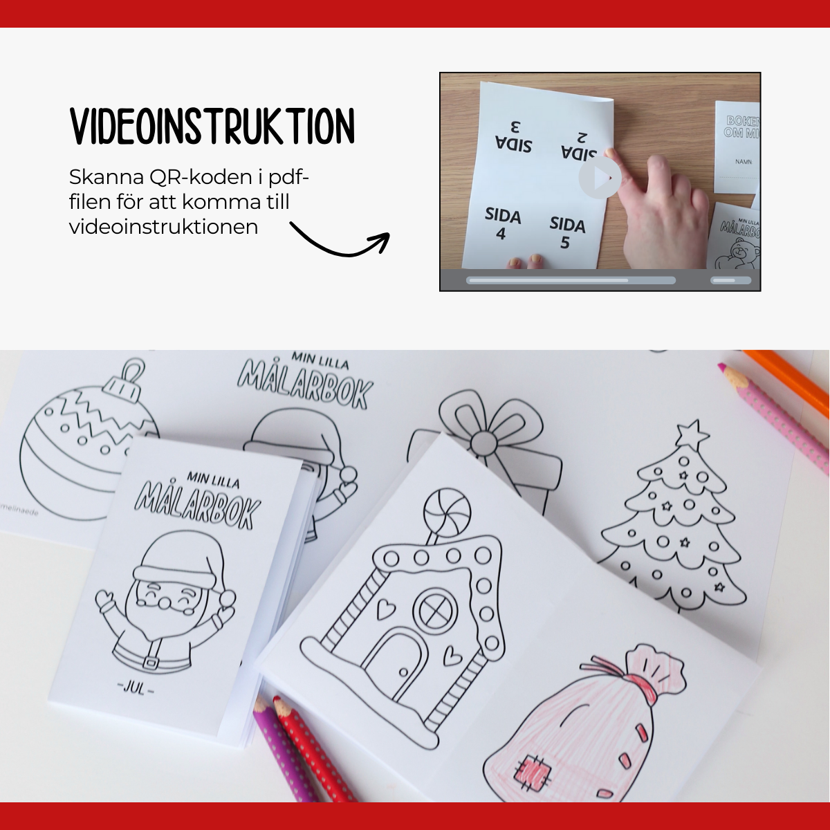 Min lilla målarbok till jul. Ett A4-papper viks och klipps till en bok med åtta sidor. En målarbild att färglägga på varje sida. Instruktion medföljer.