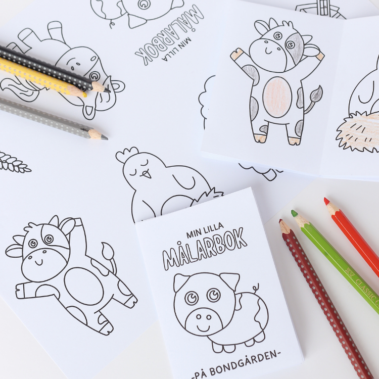 Min lilla målarbok tema bondgården. Ett A4-papper viks och klipps till en bok med åtta sidor. En målarbild att färglägga på varje sida. Instruktion på hur du viker medföljer (video och bild).