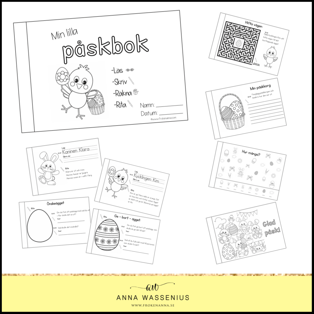 I ”Min lilla påskbok” får eleverna först finmotorisk träning genom att själva klippa ut sidorna till boken och disponera i vilken ordning de vill ha sidorna. Därefter får de arbeta med följande uppgifter:
