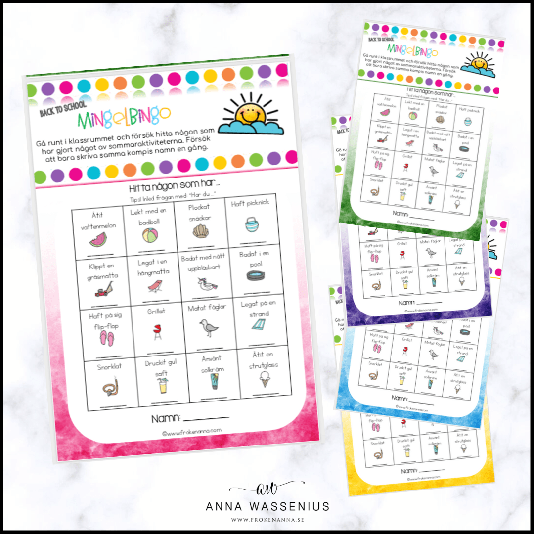 Låt eleverna mingla runt i klassrummet och fråga varandra om de gjort olika sommaraktiviteterna under sommarlovet. Bingot levereras i fem härliga färger.