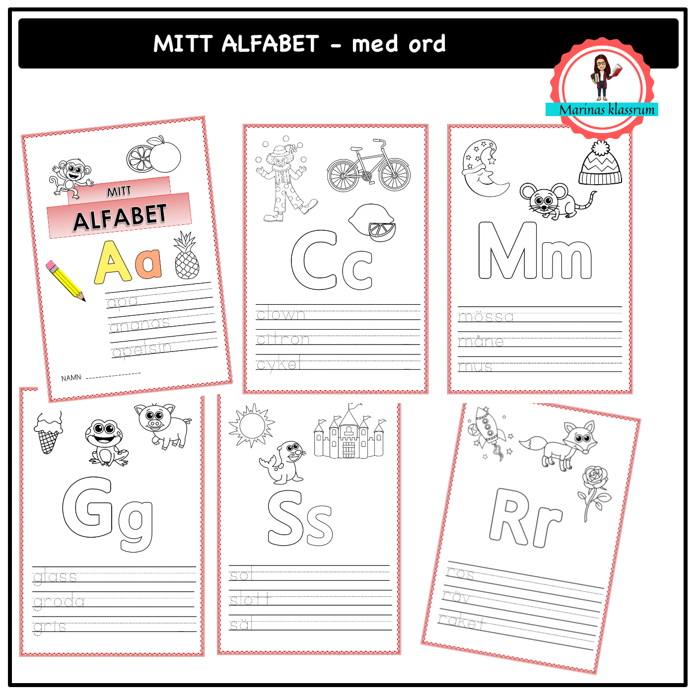 En alfabetsbok där eleven får måla den stora och den lilla bokstaven i mitten samt de tre bilderna på varje bokstav. De får även träna på att skriva de tre orden som är med på bokstavsbilden. De spårar först ordet i de streckade bokstäverna och skriver sedan ordet själv med hjälp av stödlinjerna.