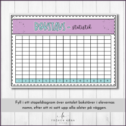 Om ni vill kan ni sätta upp alla elevers alster under den medföljande klassrumsskylten ”Våra fina namn”, och fylla i stapeldiagrammet över hur många bokstäver elevernas namn innehåller. Ha så skoj!
