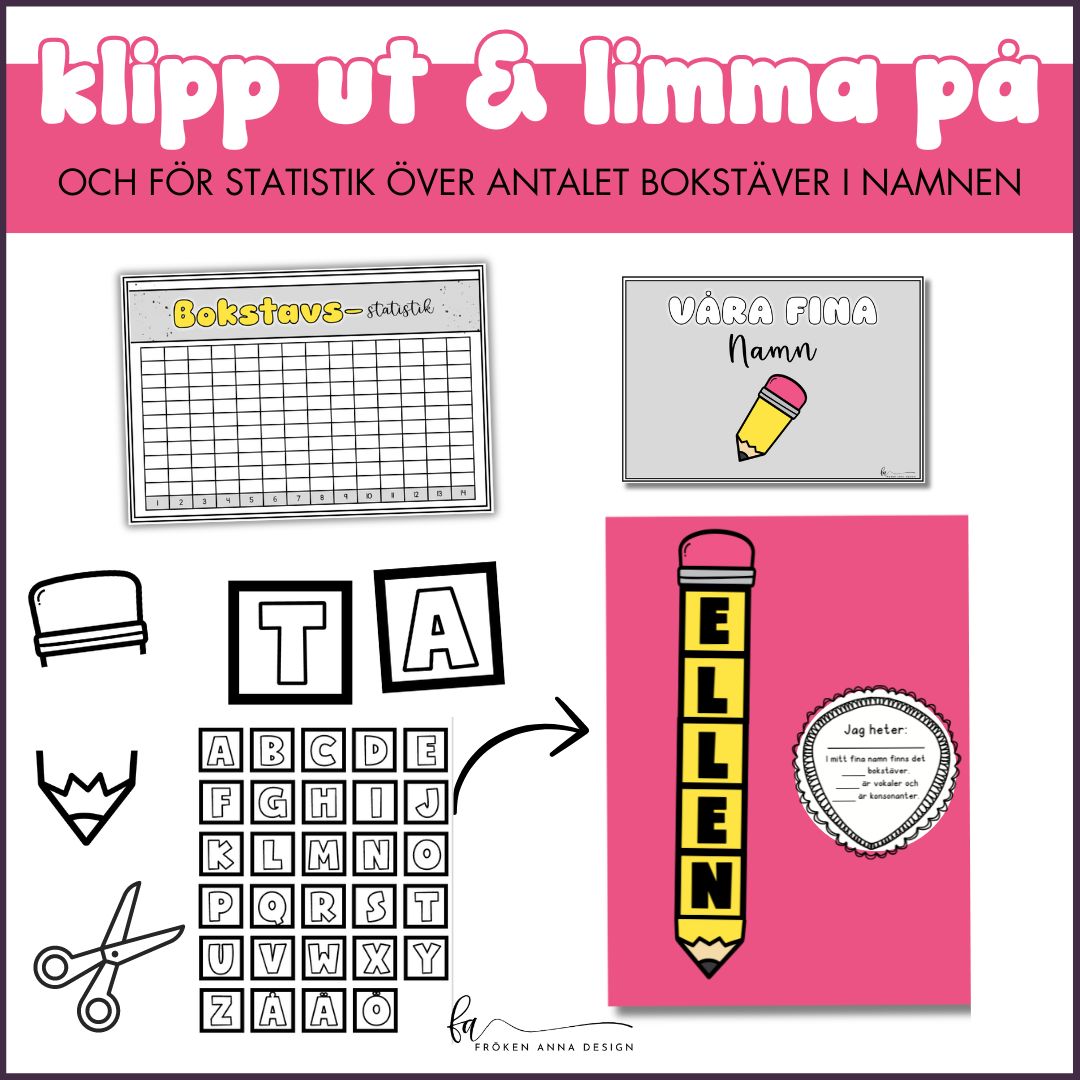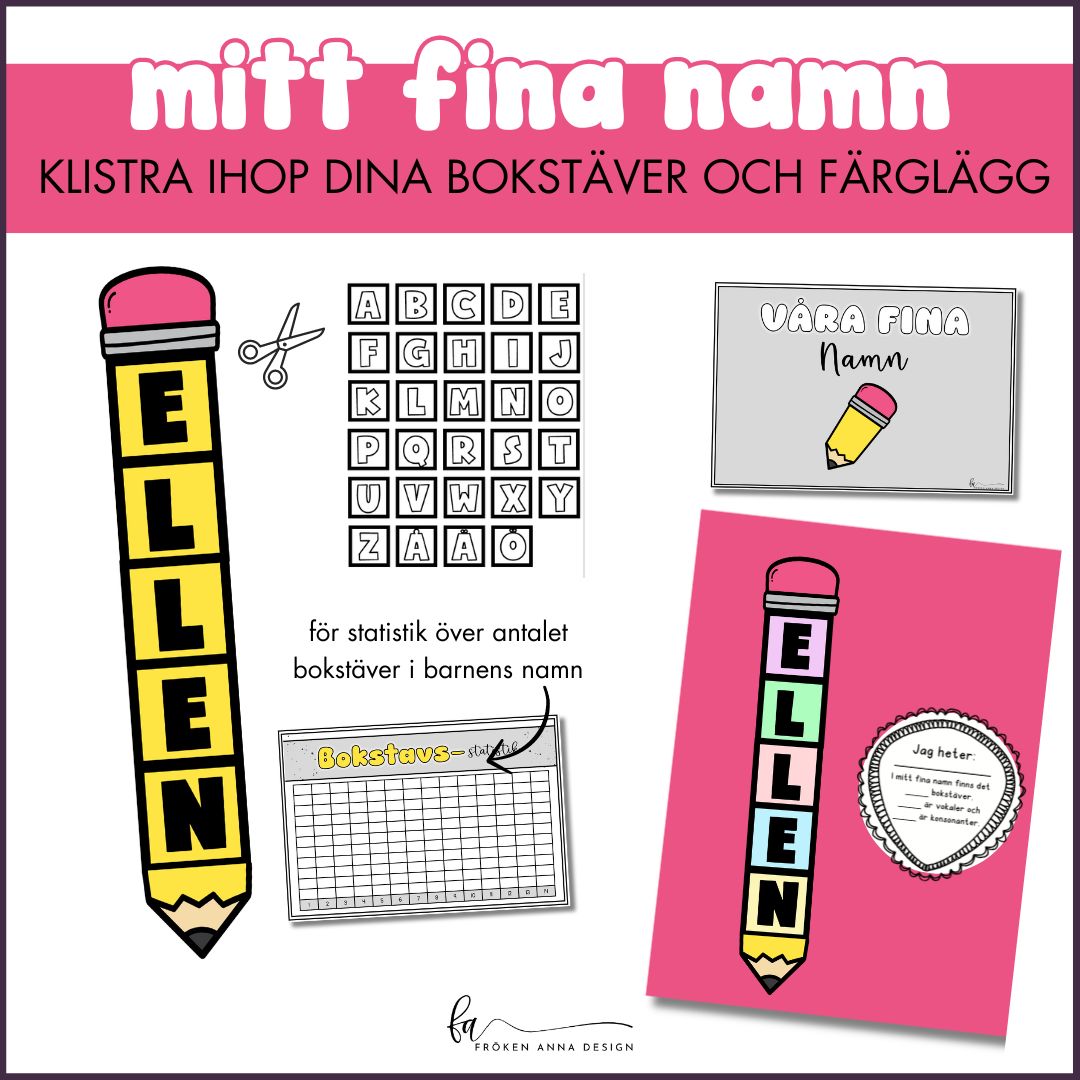 Projektet ”mitt fina namn” är en kreativ pysseluppgift där ni väver in både lite svenska och matematik. Först får eleverna färglägga bokstäverna i sitt namn och sätta ihop det till en penna, därefter limma fast dem på ett färgat papper. Räkna antalet bokstäver, vokaler och konsonanter och fyll i informationen, klipp ut och limma fast på pappret.