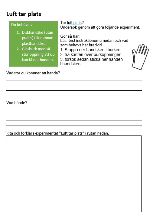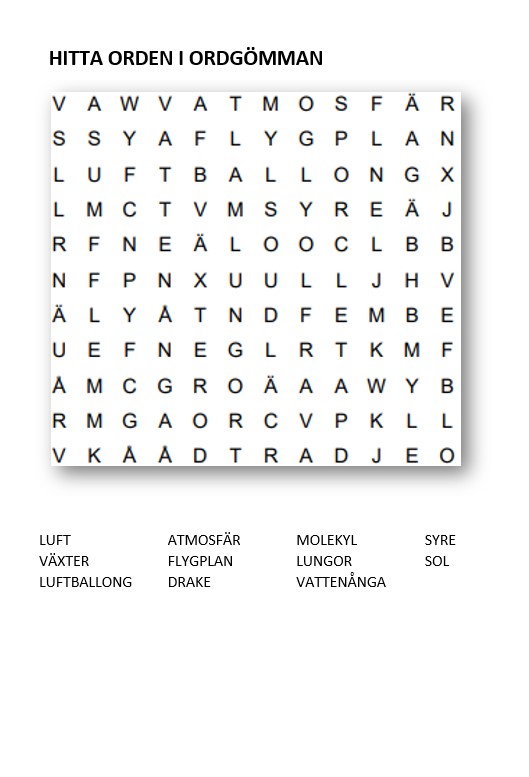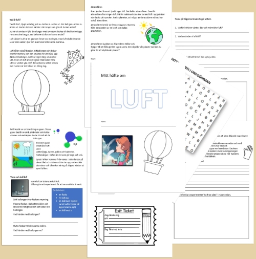 Ett häfte om luft där eleverna får läsa om luft, svara på frågor, göra enklare experiment/undersökningar, färglägga och rita. Det finns även en ordgömma och en utvärdering.