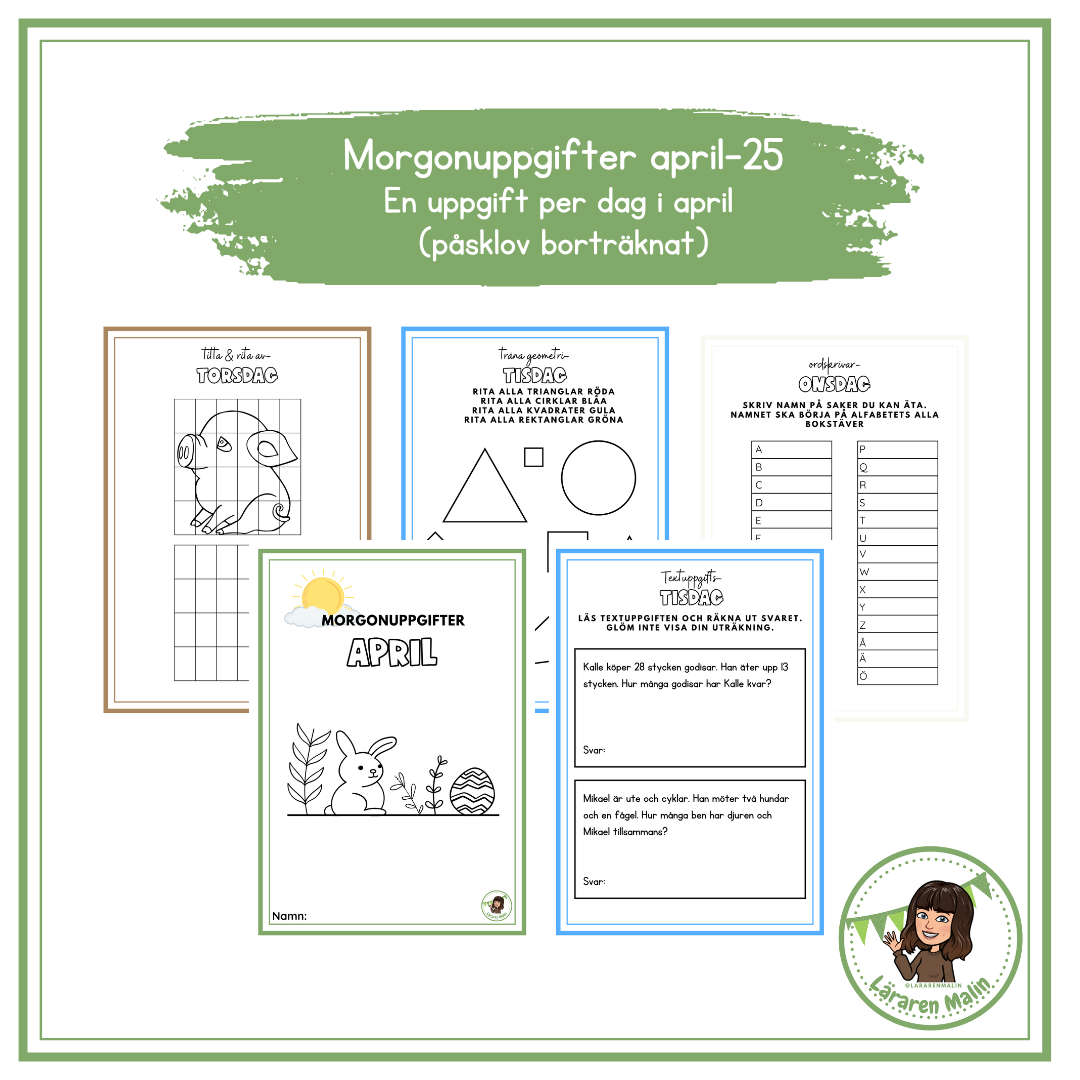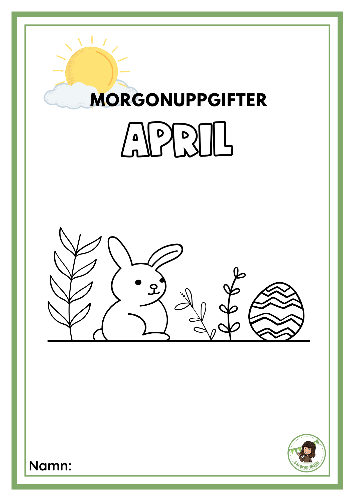 Morgon/startuppgifter för skoldagarna i april. Totalt 17 uppgifter. Mina elever smyger in till lugn musik och gör dagens uppgift. Ett nytt blad varje dag av olika karaktär.