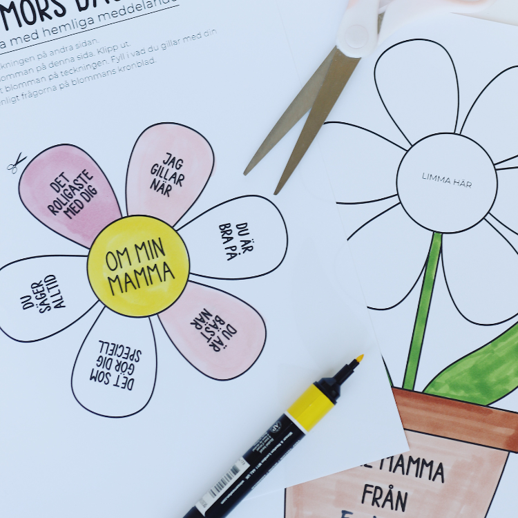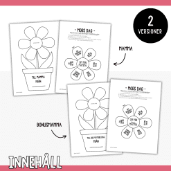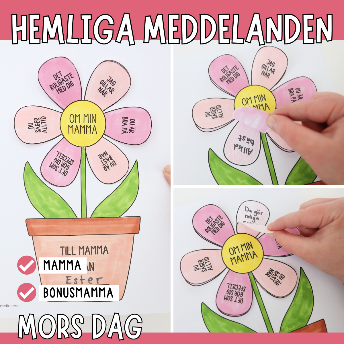 Låt barnen ge bort en blomma med dolda meddelanden till sin mamma på mors dag. Titta under blommans kronblad för att läsa vad barnen skrivit. Fyll i, färglägg, klipp ut och limma ihop till ett peppande mors dag-kort. Innehåller två varianter: