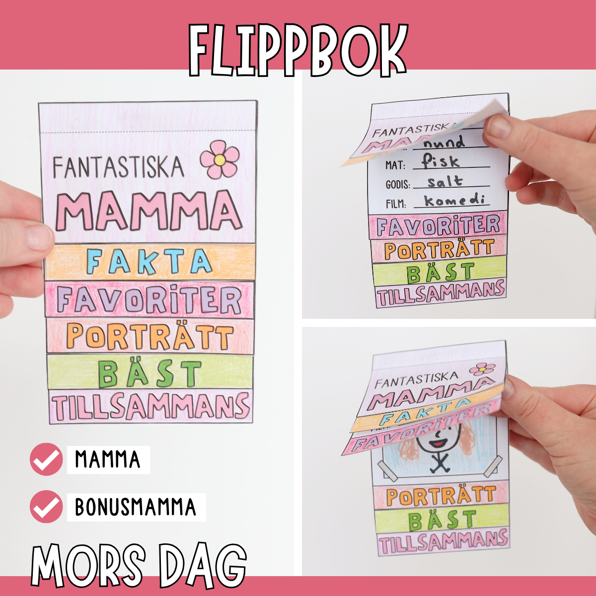 Låt eleverna pyssla en flippbok om sin mamma till mors dag. Rita, skriv och berätta om henne och varför hon är den bästa mamman. Innehåller två varianter: