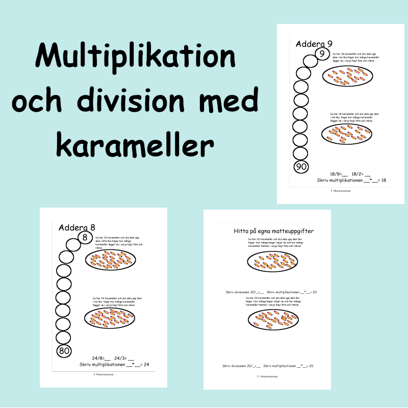 På slutet ett antal fria uppgifter där eleverna får hitta på sina egna matteuppgifter med karamellhögar.