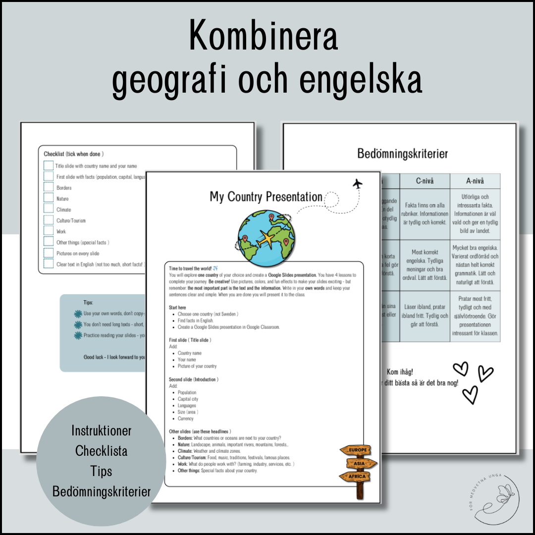 HĂ€r kommer ett projekt dĂ€r eleverna fĂ„r kombinera engelska med geografi. De ska vĂ€lja ett land som de ska forska och och sedan presentera pĂ„ engelska. I detta projekt trĂ€nar eleverna pĂ„ att förstĂ„, skriva och prata engelska samtidigt som de utvecklar sina kunskaper om vĂ€rlden đ De fĂ„r Ă€ven trĂ€na pĂ„ att söka information, arbeta sjĂ€lvstĂ€ndingt och arbeta i Google slides.