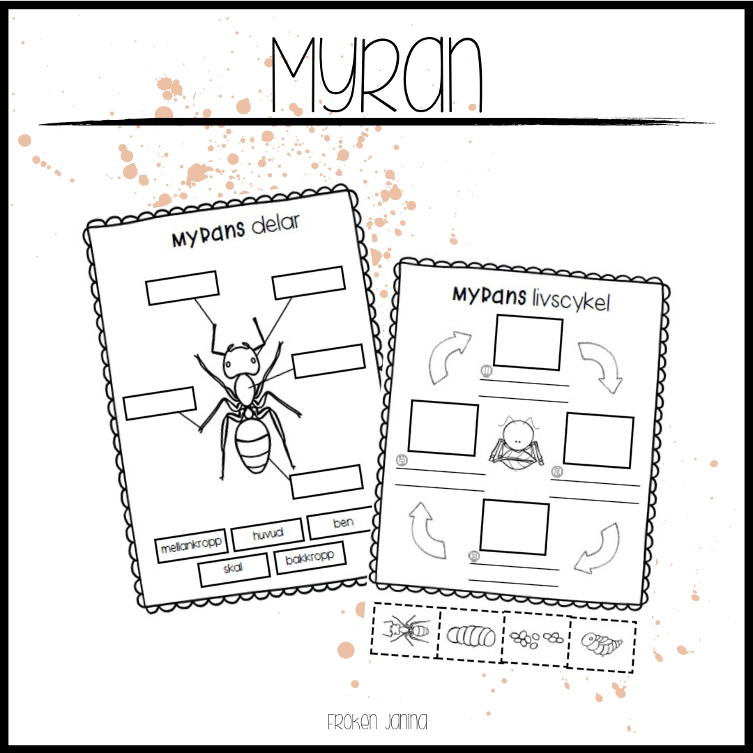 Två arbetsblad som berör myrans livscykel och myrans delar.