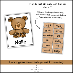 -Nallebild och ordkort till gemensam samling med ord som beskriver hur en nalle är och ser ut.